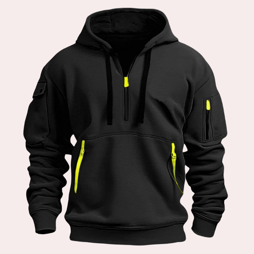 The Men's Khaki Tactical Hoodie with Zipper Pockets & Reinforced Elbows is a versatile and stylish addition to any wardrobe, offering a perfect balance between comfort and style. This hoodie is designed for both outdoor adventures and relaxing at home, making it an ideal choice for various occasions. Available in four distinct colors—Khaki, Black, Gray, and Marine Blue—this hoodie caters to diverse style preferences. The hoodie is crafted from high-quality materials, ensuring comfort throughout the day and making it suitable for use in spring, autumn, and winter. Its tactical design includes practical zipper pockets, providing secure storage for essentials, and reinforced elbows for added durability, making it a reliable choice for active individuals. The hoodie is available in sizes S, M, L, and XL, ensuring a comfortable fit for different body types. The Men's Khaki Tactical Hoodie can be effortlessly paired with sneakers for a casual, laid-back look, while its rugged appearance allows for a masculine and elegant style. Whether you're heading out for a casual outing or simply lounging at home, this hoodie offers the perfect blend of functionality and fashion, making it a must-have piece in any modern man's wardrobe.