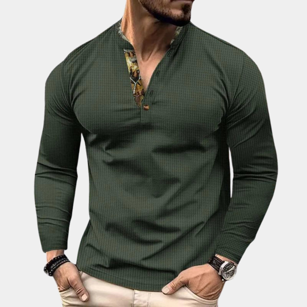 Introducing the Men's Slim Fit Henley in Forest Green, a versatile waffle knit long sleeve pullover that combines comfort and style for any occasion. This Henley is available in a range of colors including Light Green, Black, Gray, Marine Blue, and Wit, allowing you to choose the perfect shade to match your personal style. With sizes ranging from S to 3XL, this pullover ensures a perfect fit for everyone. Crafted from a comfortable cotton blend, this Henley is ideal for the transitional seasons of spring, autumn, and winter, providing warmth without sacrificing breathability. The waffle knit texture adds a unique touch, enhancing the overall aesthetic and making it a standout piece in any wardrobe. Whether you're heading out for a casual day or relaxing at home, this Henley offers the perfect balance of style and comfort. Pair it with sneakers for a laid-back look or dress it up with a jacket for a more refined appearance. The slim fit design accentuates a masculine silhouette, making it a must-have for those who appreciate both fashion and functionality. Experience the perfect blend of comfort, style, and versatility with the Men's Slim Fit Henley, a staple piece that will elevate your wardrobe throughout the year.
