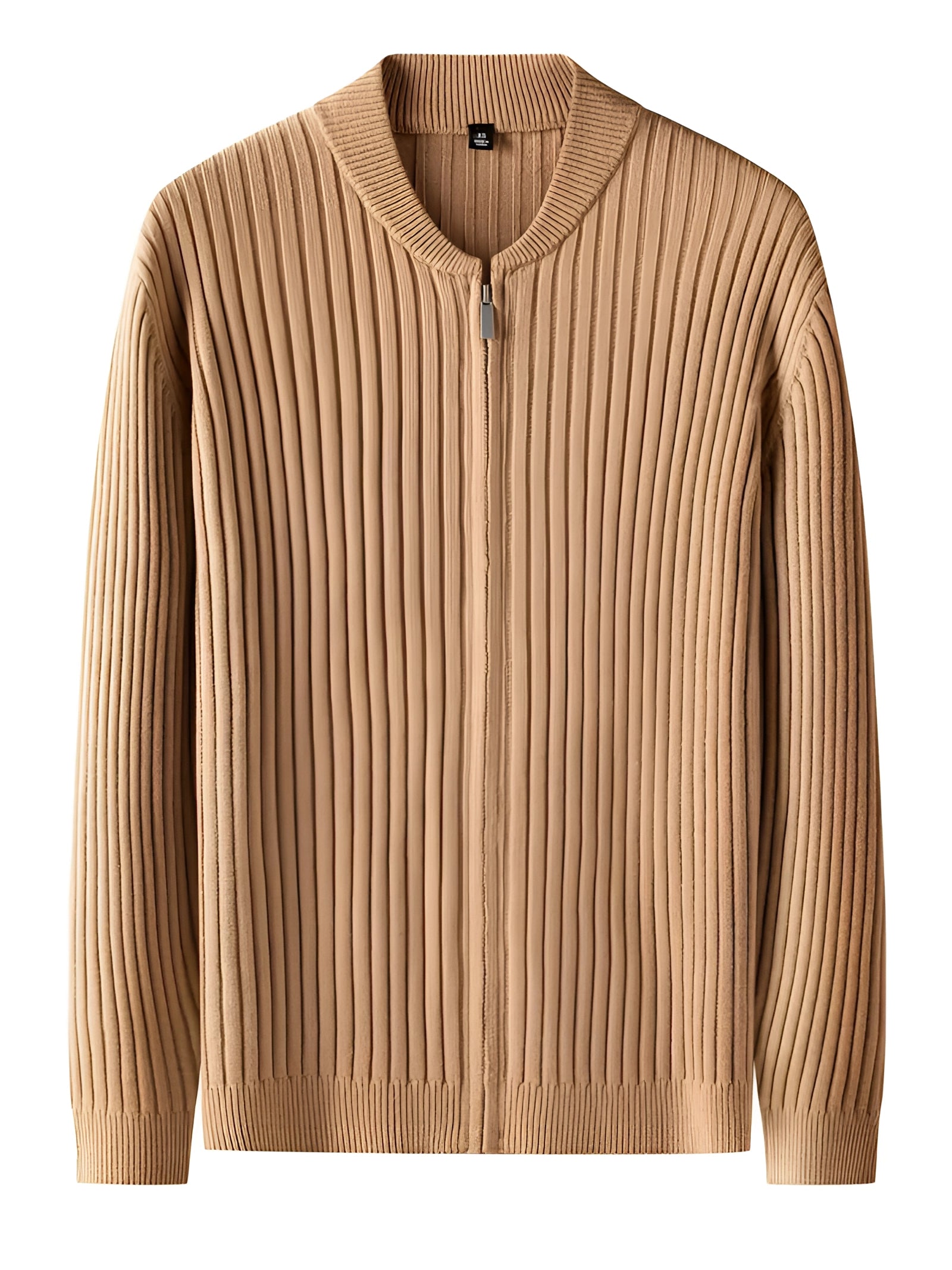 | 1 - Men's Tan Ribbed Knit Zip-Front Cardigan - Lightweight Casual Sweater | |