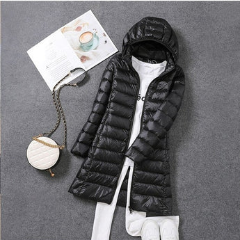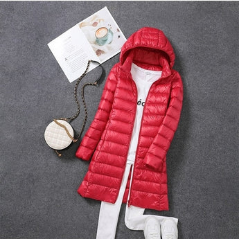 This ultra-lightweight, packable long puffer coat for women is the epitome of fashionable warmth. Embrace the season with style!