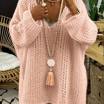 This sweater features long sleeves, a V-neckline, and an oversized fit. Pair it with jeans to complete your winter look!