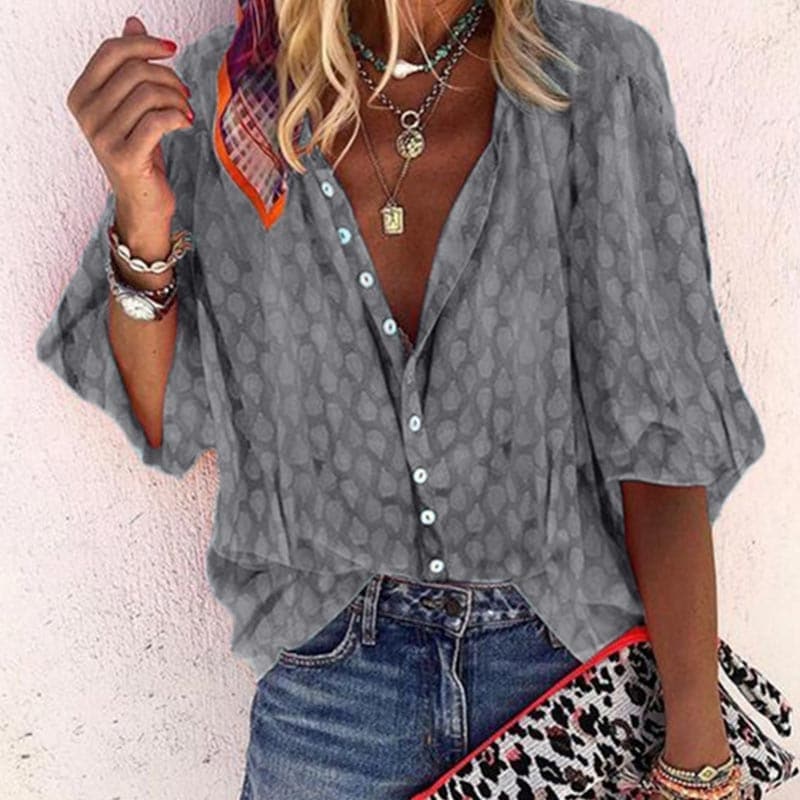 Key Features: Airy, lightweight fabric perfect for warm seasons. Subtle leaf-like pattern. V-neckline and three-quarter length sleeves with soft detailing. Front button placket.