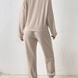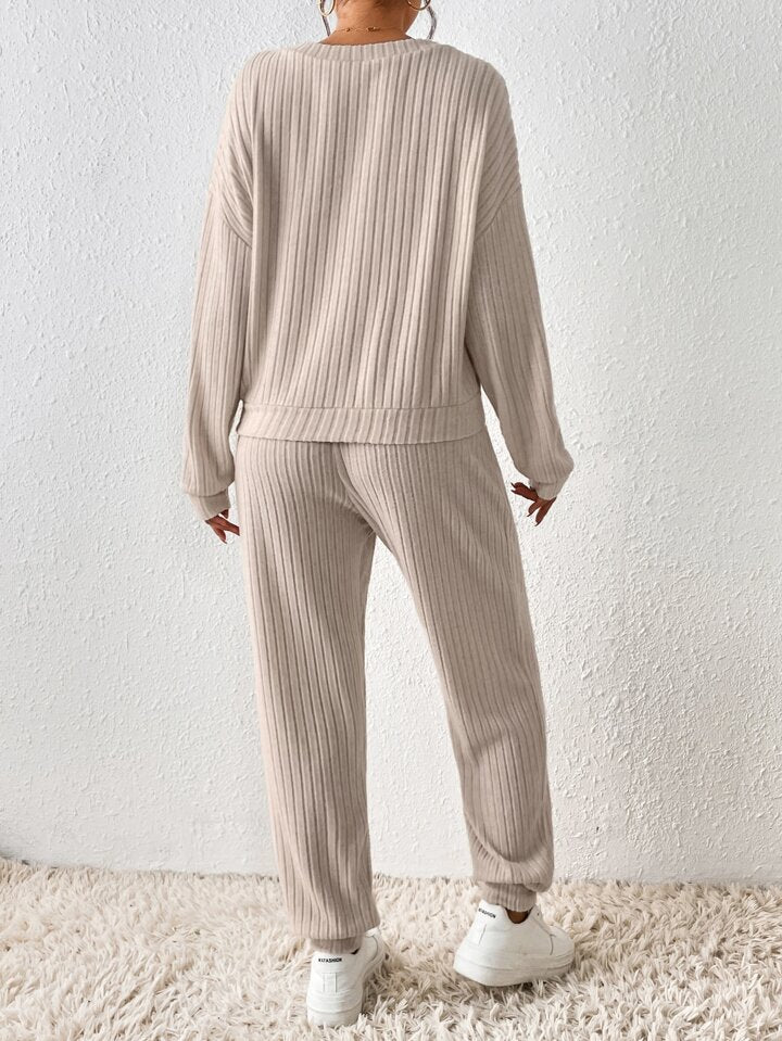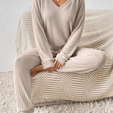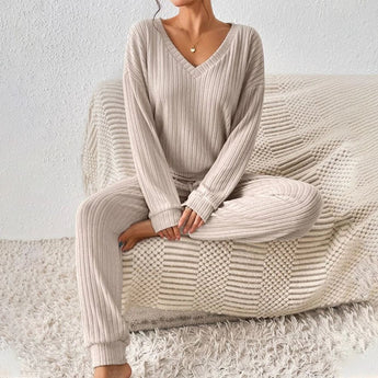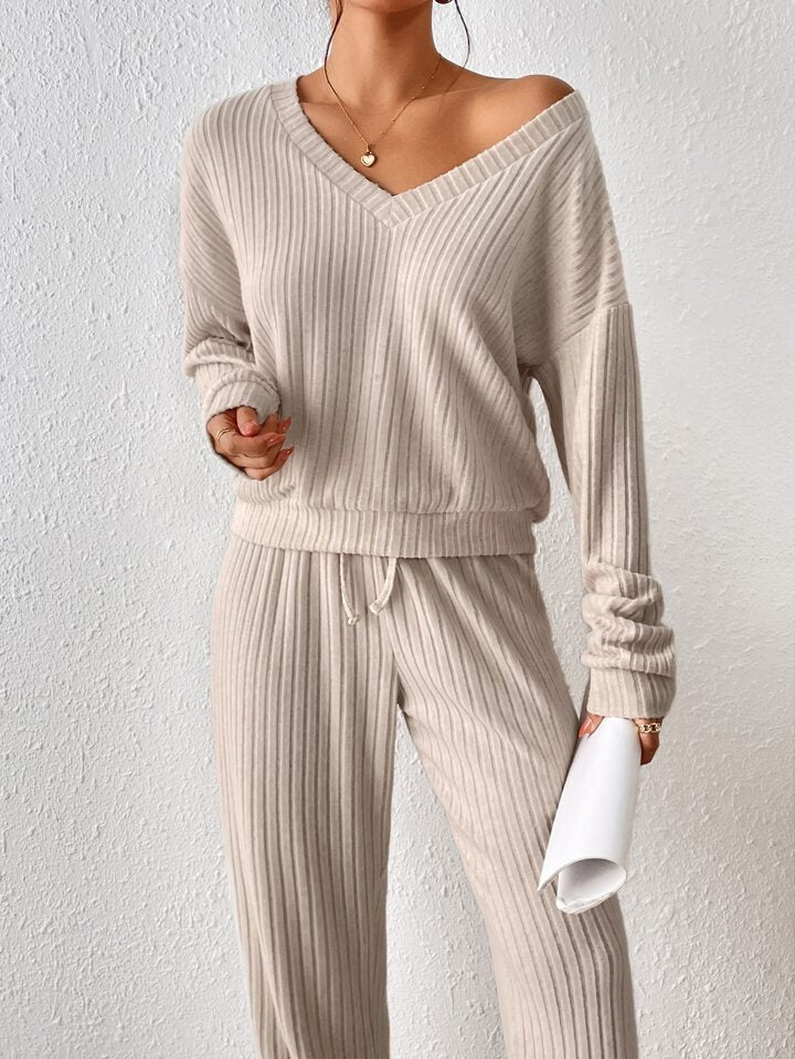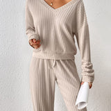 This two-piece set featuring a V-neckline is perfect for casual outings and everyday wear. Crafted from a comfortable blended fabric, this stylish ensemble offers breathability and comfort throughout the day. The simple design paired with the V-neck lends the outfit a timeless appeal.