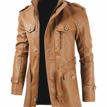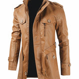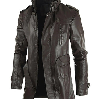The Avencea Vintage Long Leather Jacket for Men, available in classic colors such as Black and Dark Brown, is the perfect choice for discerning men who appreciate fashionable appearances.