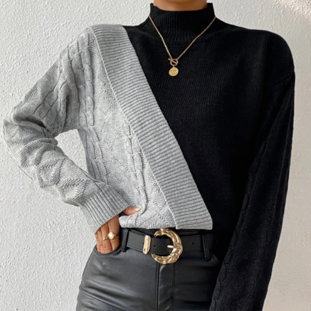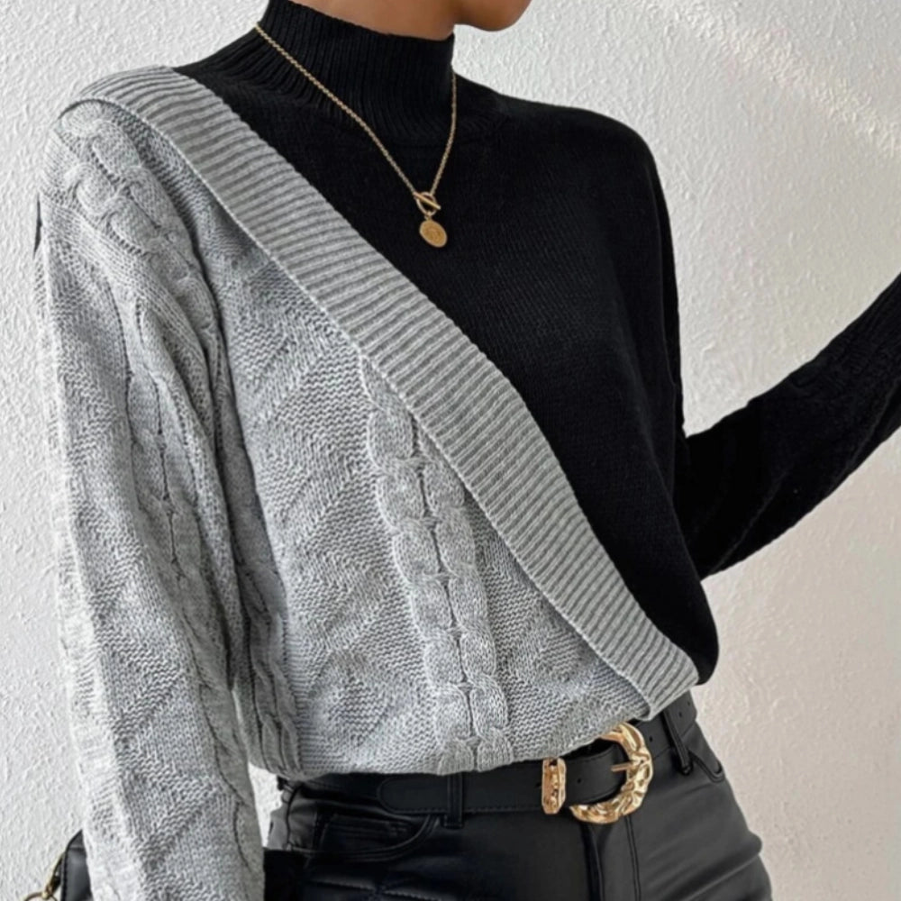 The Black Ribbed Knit Turtleneck Sweater with Chunky Contrast Sleeves is a stylish and versatile addition to any wardrobe. This sweater is available in a sophisticated gray color and comes in a range of sizes from XS to XL, ensuring a perfect fit for everyone. The standout feature of this sweater is its unique asymmetrical cut, which provides a trendy and modern look that is perfect for both casual days and cozy evenings at home. The sweater is designed with chunky contrast sleeves that add a touch of flair and make it a statement piece. Made from a comfortable ribbed knit fabric, it is ideal for the spring, autumn, and winter seasons, offering warmth and style. The sweater's roomy fit is flattering, accentuating curves while maintaining a refined appearance. It can be dressed down with sneakers for a relaxed look or accessorized for a more polished style. This combination of comfort, versatility, and flattering design makes the Black Ribbed Knit Turtleneck Sweater a must-have for fashion-forward individuals looking to enhance their wardrobe with a piece that is both functional and fashionable.