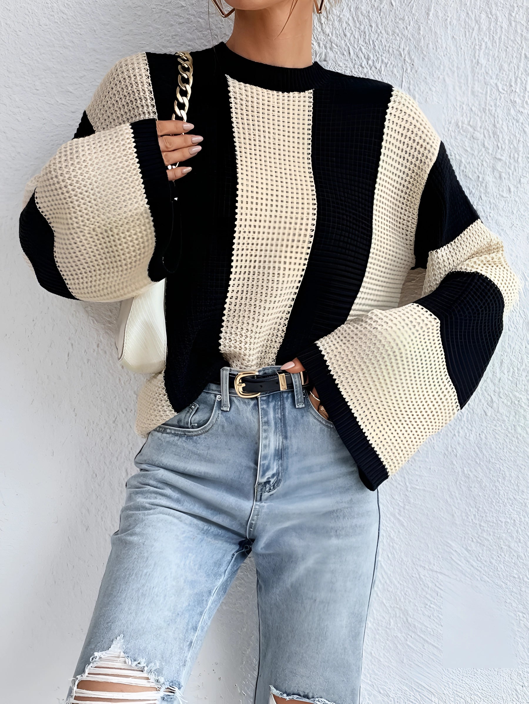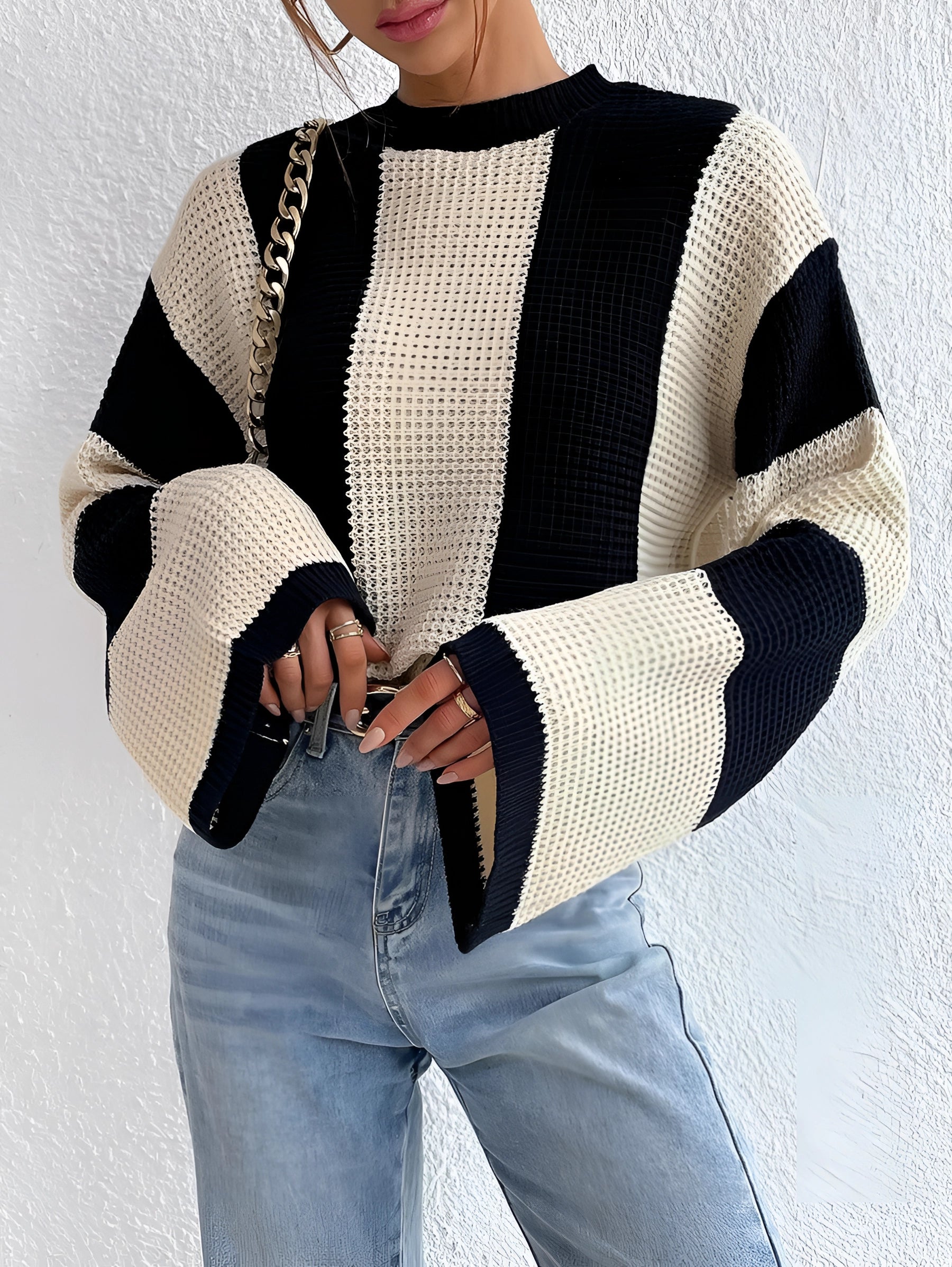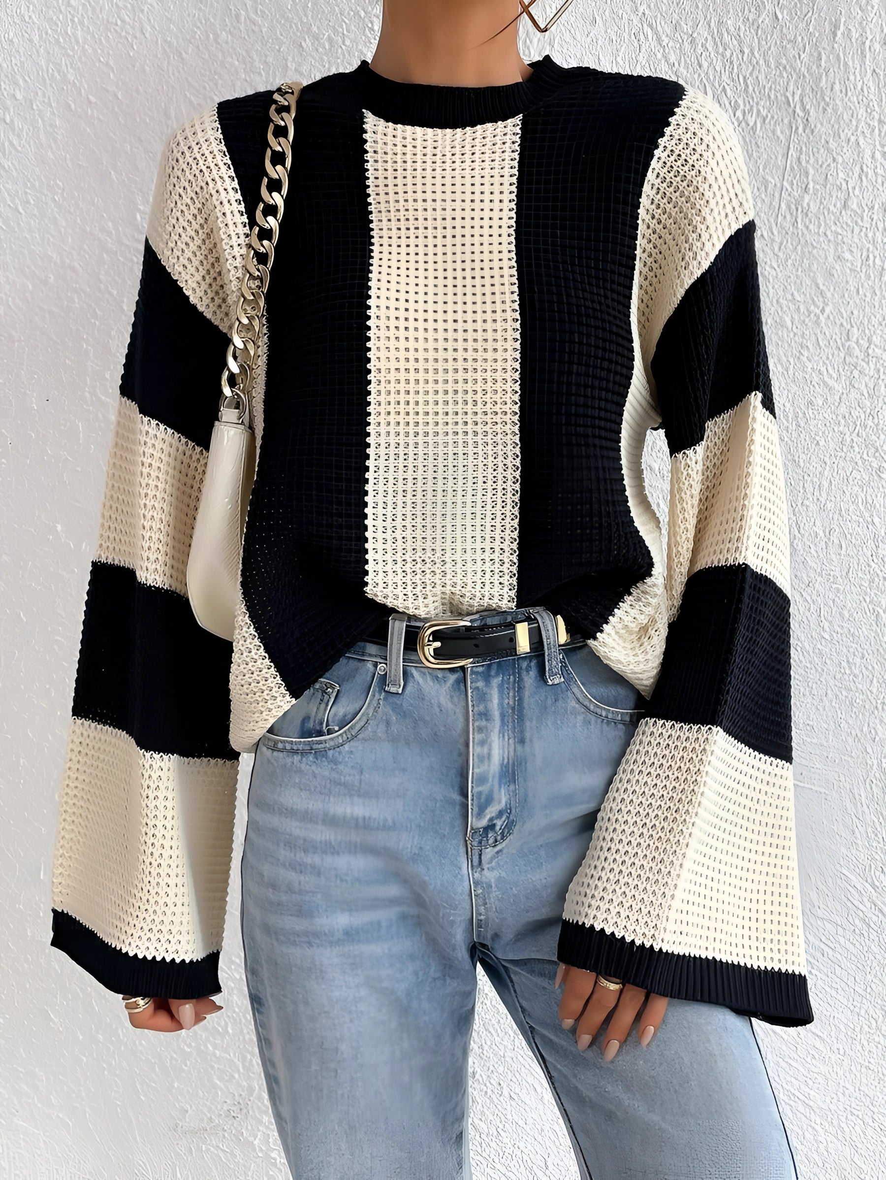 Black & White Striped Bell Sleeve Knit Sweater - Trendy Autumn Fashion