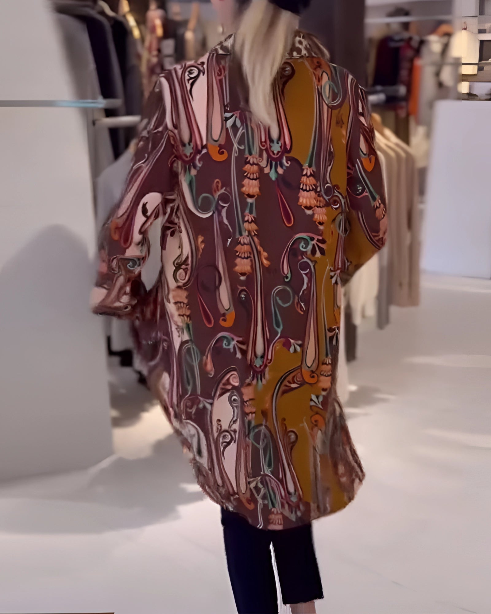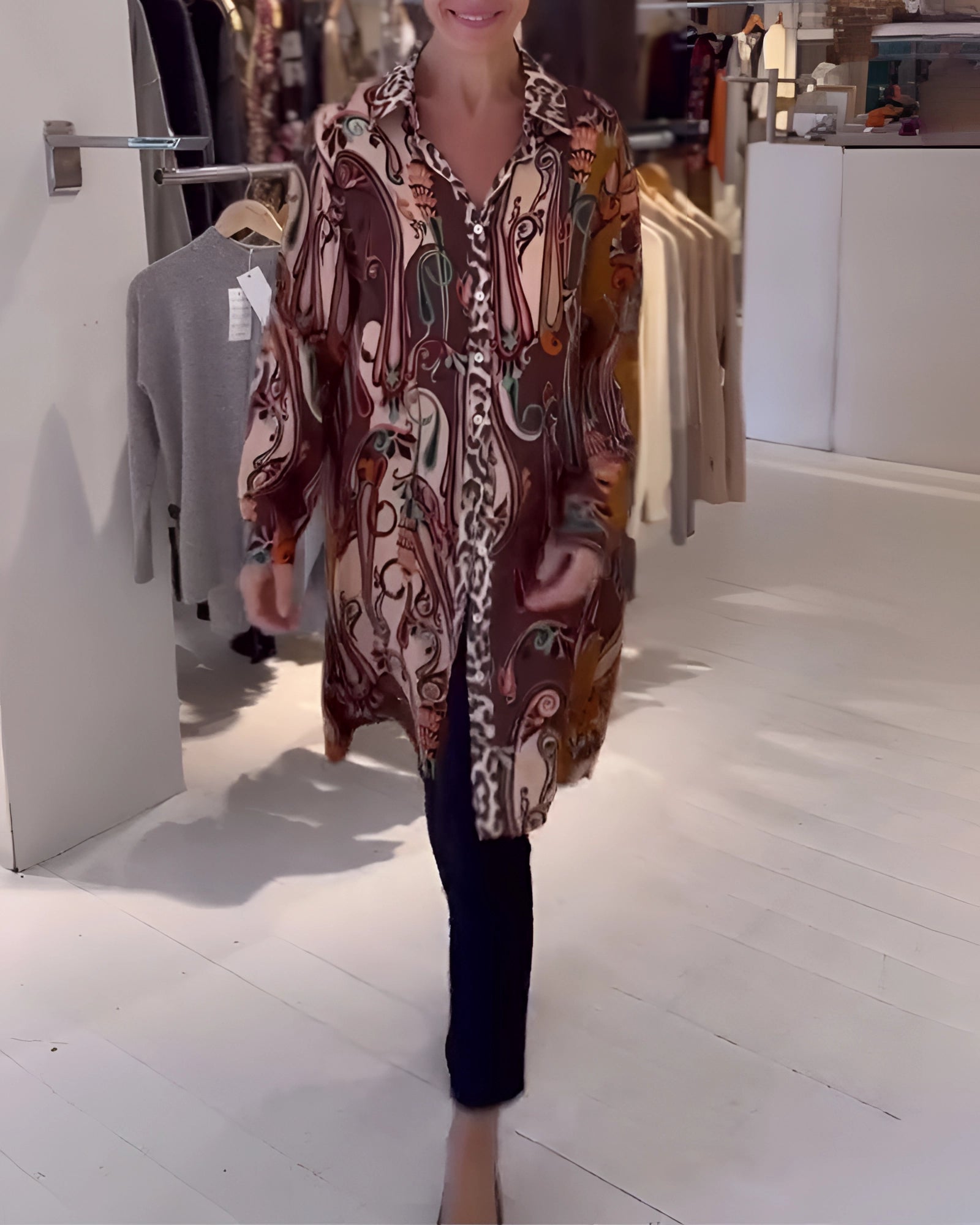 The Bohemian Silk Blouse, also known as the Designer Printed Bell Sleeve Top, is a stunning piece that combines retro elegance with a modern twist. This blouse, available in a rich brown color, is designed to cater to a variety of body types with sizes ranging from S to 3XL. The Claudia blouse is perfect for those seeking a sophisticated style with a vintage accent. Its long sleeves and exclusive vintage print make it a unique and captivating addition to any wardrobe. Crafted from high-quality fabric, it ensures both comfort and durability, making it suitable for any occasion, from work to casual outings. The blouse's main selling points include its exclusive vintage print, which sets your look apart, optimal comfort with its soft and breathable fabric, and its versatile and chic nature, making it suitable for multiple occasions, from work to social events. The size chart provides detailed measurements for bust and length, ensuring a perfect fit. For the best fit, it is recommended to choose a size up; for instance, if you usually wear a size L, it is advisable to opt for an XL. Add a touch of class to your wardrobe with the Claudia blouse, a perfect blend of style and comfort.