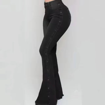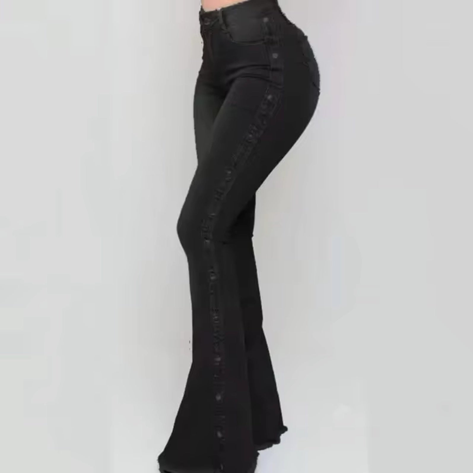 The Button-Side Flared Jeans are a stylish embodiment of boho chic, designed to offer both comfort and a flattering fit. Crafted from high-quality stretch denim, these high-waisted jeans provide a snug silhouette that accentuates your curves while ensuring ease of movement. The vintage appeal of these jeans is highlighted by decorative buttons and a floor-length cut that elongates the legs, making them a standout piece in any wardrobe. Available in a range of colors including Blue, Black, and Gray, and sizes from S to 3XL, these jeans cater to a variety of style preferences and body types. The jeans feature a flattering fit at the waist and hips, flaring out below the knee to add a bold retro flair to any outfit. Perfect for streetwear and autumn fashion, they offer durability and flexibility for everyday wear. With the added benefit of free shipping, these jeans are not only a fashion statement but also a practical choice for those seeking elegance and style in their daily attire. Whether you're dressing up for a night out or keeping it casual, the Button-Side Flared Jeans are a versatile addition to your collection, promising to enhance your look with their unique design and timeless appeal.