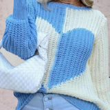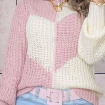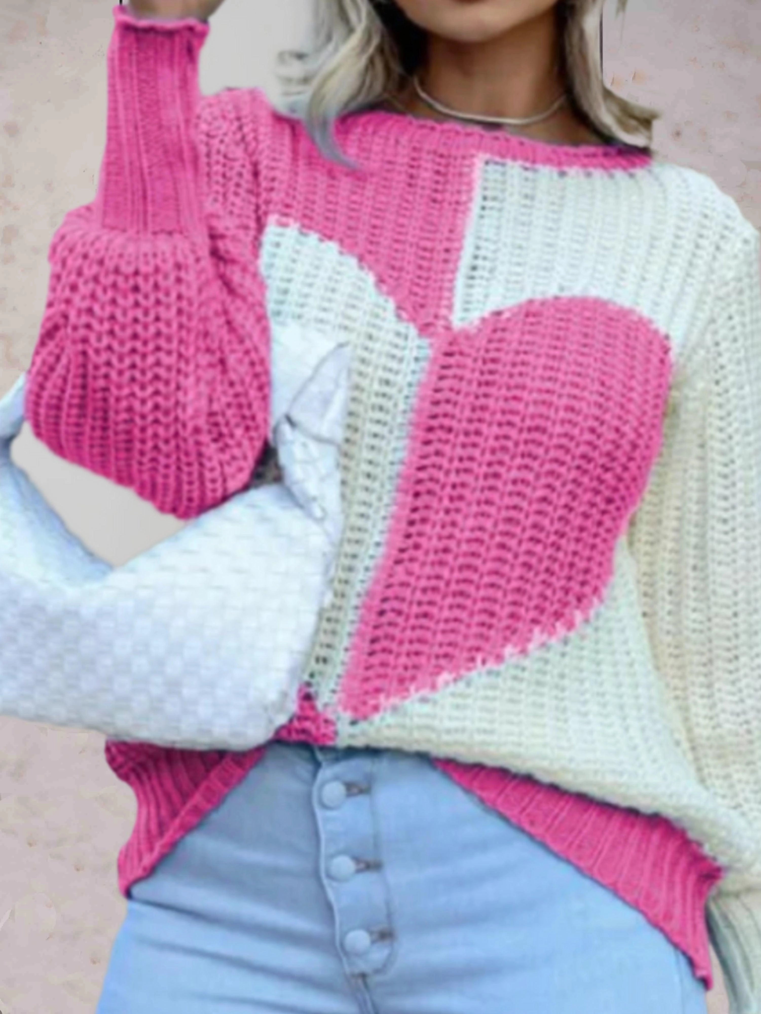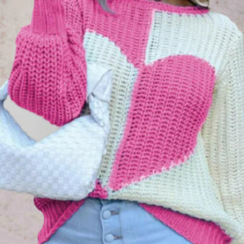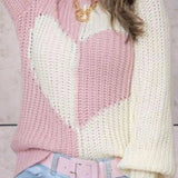 Chunky Knit Heart-Pattern Sweater - Pink & White Cozy Pullover