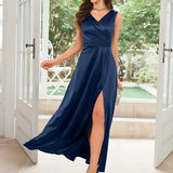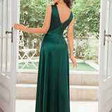 The Emerald Green Satin V-Neck Wrap Gown with High Slit is a stunning piece crafted from luxurious satin that exudes elegance and sophistication. This gown is available in a variety of colors including Green, Navy blue, Light blue, and Red, and comes in sizes ranging from XS to XXL, ensuring a perfect fit for every body type. The gown features a sleeveless and backless design, accentuated by a deep V-neckline and a daring thigh-high slit, creating a flattering silhouette that is ideal for formal occasions, weddings, or evening events. The satin material not only provides a soft and silky touch but also offers a comfortable and lightweight feel, making it perfect for indoor occasions or mild climates. The gown's attractive and elegant design is complemented by the luxurious satin fabric, which enhances its overall appeal. Additionally, the gown comes with the benefit of free shipping, adding to its allure. This gown is a perfect choice for those looking to make a statement with a sophisticated and stylish ensemble.