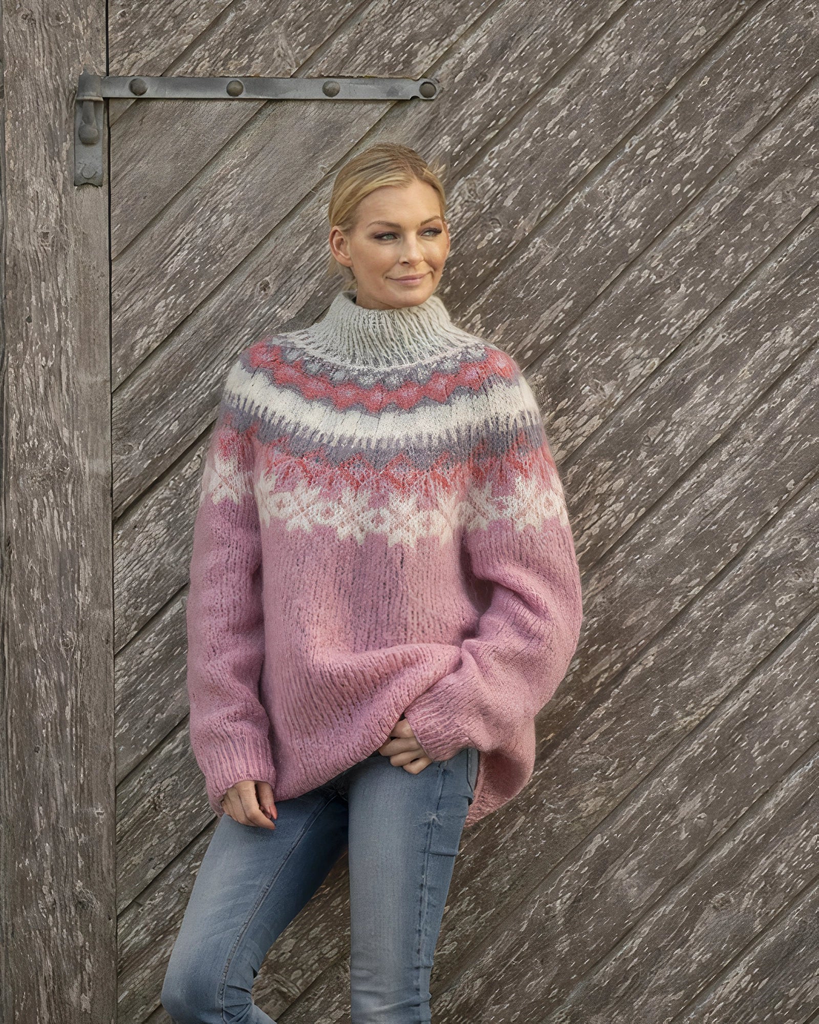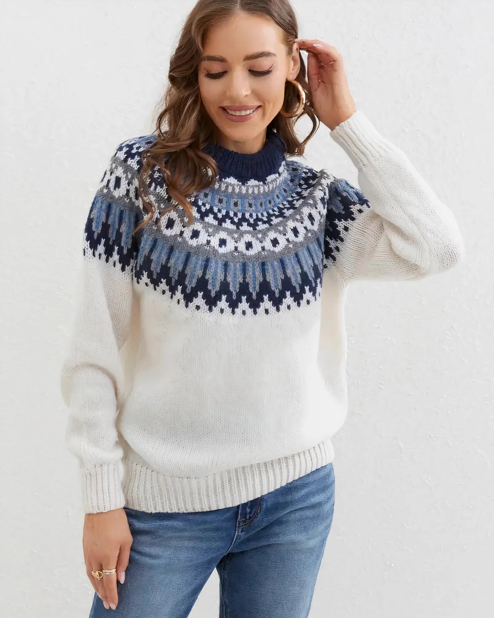 The Fair Isle Wool Sweater, also known as the Nordic Winter Pullover, is a standout piece in the realm of handmade ethical fashion. This sweater is available in a variety of colors including Blue, Pink, Green, and White, and comes in sizes ranging from S to 2XL, ensuring a perfect fit for everyone. The Nalora Rollkragenpullover is designed with a stylish print pattern that adds a unique and fashionable touch to any wardrobe. Its high turtleneck provides warmth and comfort, making it an ideal choice for the colder months. The soft knit fabric ensures a comfortable fit, perfect for both relaxed and chic looks. This versatile pullover is suitable for everyday wear, cozy evenings, or a laid-back weekend, making it a must-have addition to your closet. The three main unique selling points of this sweater are its stylish print, which enhances your look with a distinctive flair; the warming turtleneck, which offers protection against the cold while providing a snug feeling; and the soft knit fabric, which guarantees comfort and is perfect for both casual and elegant outfits. Embrace the blend of style and comfort with the Fair Isle Wool Sweater, a perfect companion for all occasions during the chilly season.