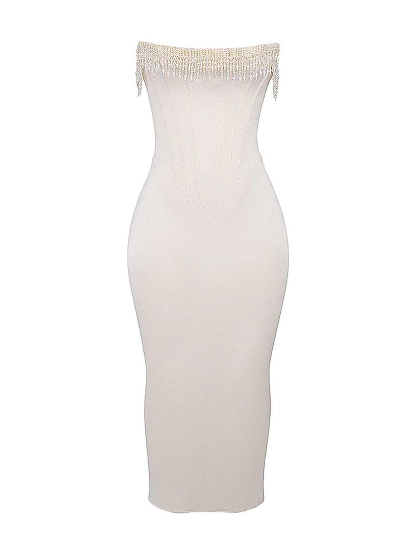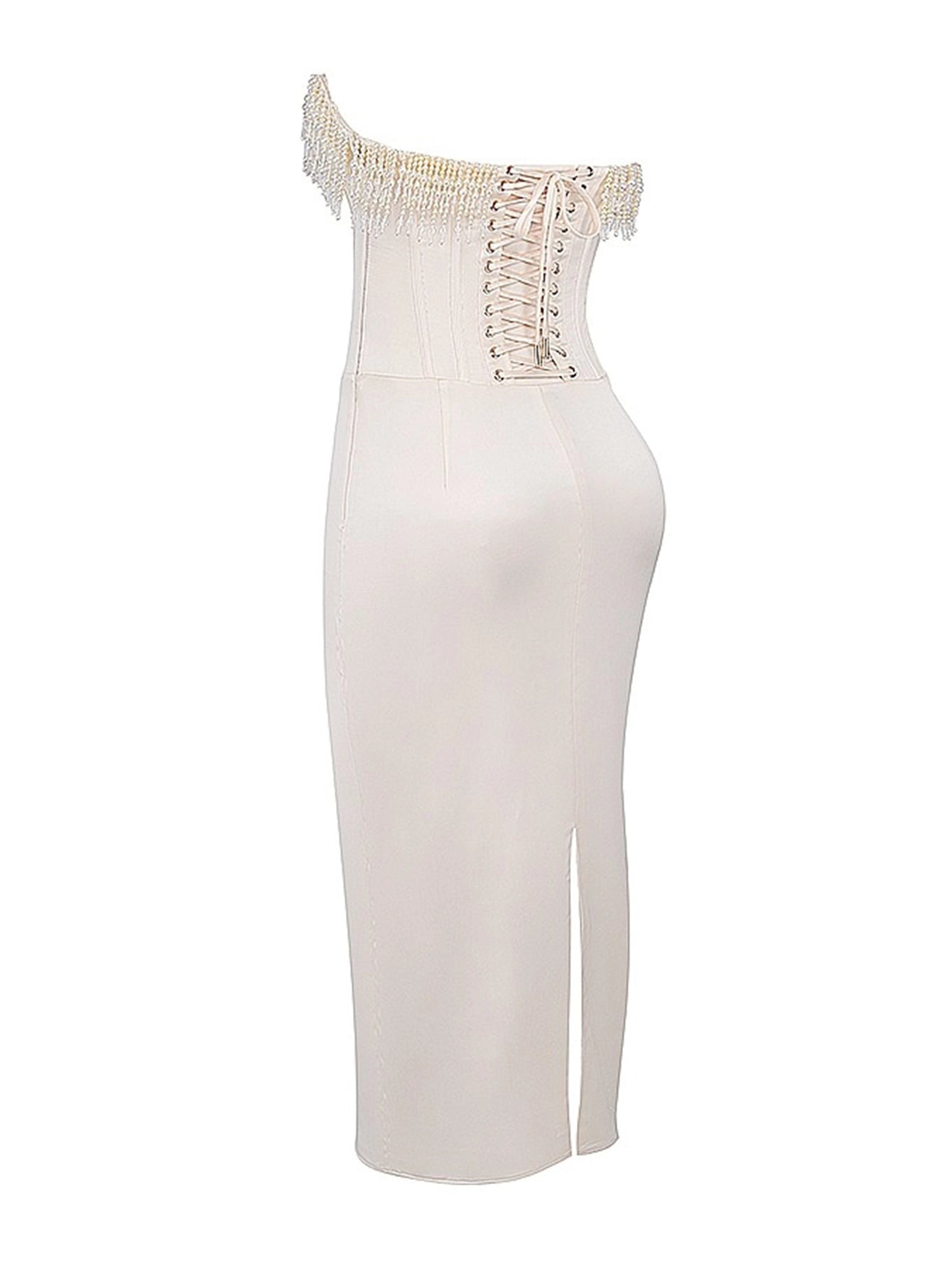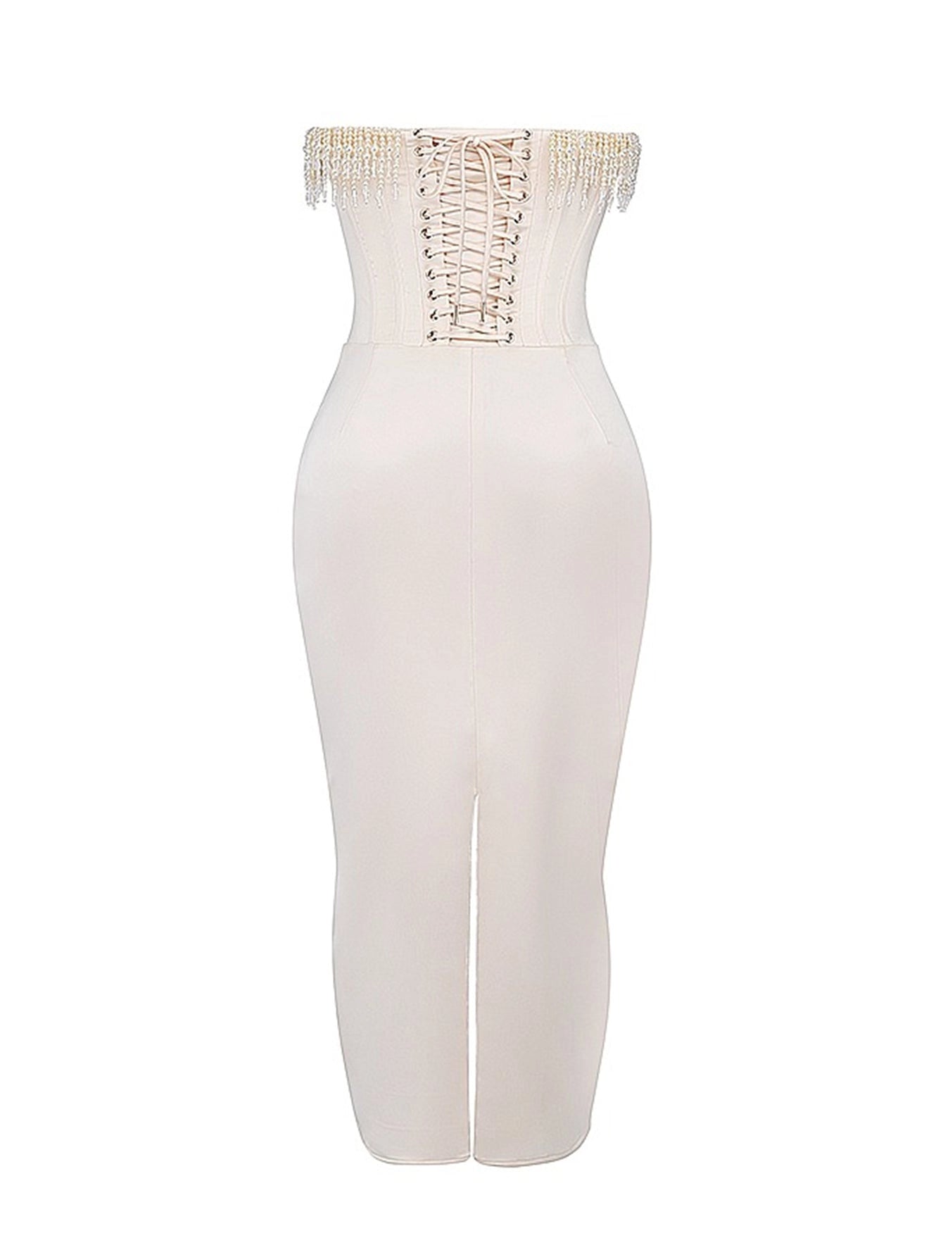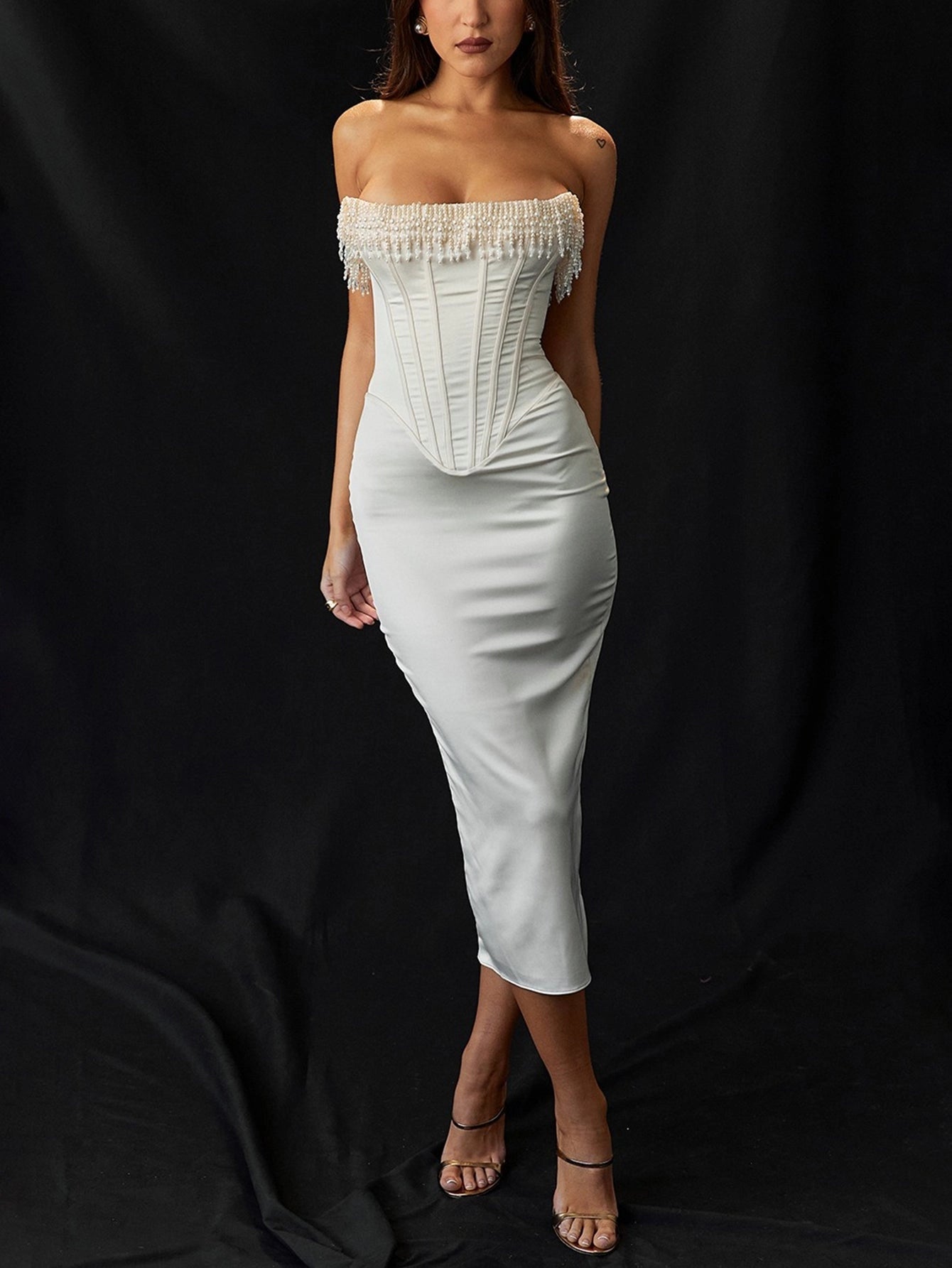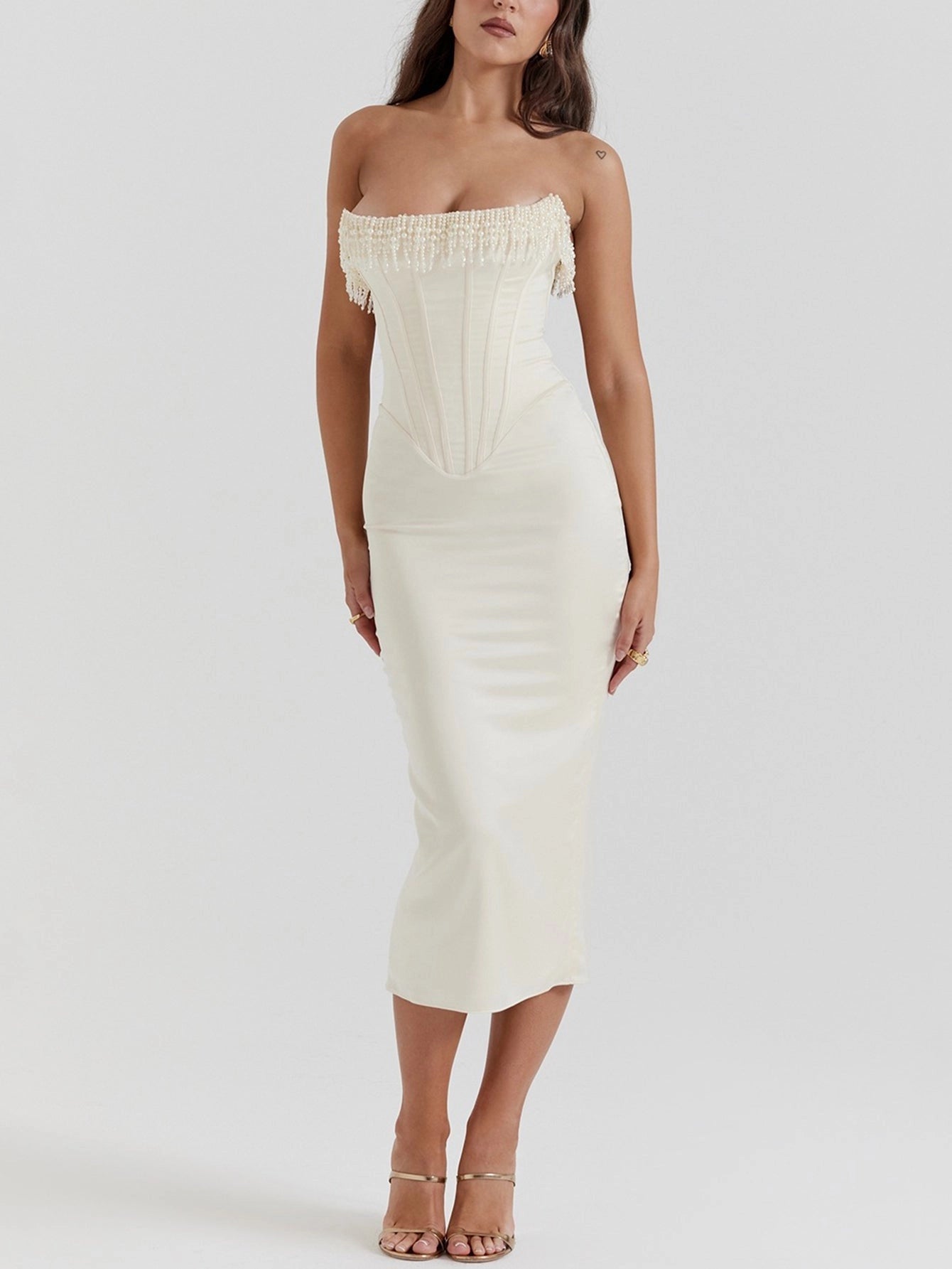 The Luxury Ivory Embroidered Bridal Gown with Beaded Corset is a masterpiece of elegance and sophistication, designed to make any bride feel like royalty on her special day. This exquisite gown is available in a pristine white color, offering a timeless and classic look that is perfect for weddings. The gown is available in a range of sizes from XS to L, ensuring a perfect fit for every bride. One of the standout features of this bridal gown is its intricately embroidered design, which adds a touch of luxury and refinement. The beaded corset not only enhances the gown's aesthetic appeal but also provides a flattering silhouette, accentuating the bride's natural curves. The strapless design elegantly highlights the shoulders, adding a modern twist to the traditional bridal look. This gown is crafted from high-quality materials, ensuring comfort and durability throughout the wedding day. The attention to detail is evident in the delicate beadwork and fringe details, which add a sophisticated finish to the overall design. Ideal for weddings and other special occasions, this gown is a true showstopper that will leave a lasting impression. Whether you're walking down the aisle or attending a formal event, the Luxury Ivory Embroidered Bridal Gown with Beaded Corset is the perfect choice for those seeking elegance and style.