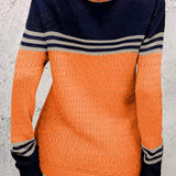 The Navy Blue & Orange Striped Sweater, also known as the Riselda Knit Sweater, is a chic piece of fall knitwear that seamlessly blends style with comfort. This sweater features bold block stripes that create a unique and modern look, making it an ideal choice for both casual and elegant outfits. Crafted from soft and breathable material, it ensures that you remain comfortable in any situation while maintaining a fashionable appearance. The sweater is available in a striking orange color and comes in a range of sizes from S to 2XL, catering to a variety of body types. The Riselda sweater stands out for its stylish block stripe design, which offers a contemporary and chic aesthetic. Additionally, the soft knit material provides warmth and comfort, making it perfect for the cooler fall months. Its versatility is another key selling point, as it can be effortlessly paired with jeans or skirts, suitable for everyday wear or special occasions. The sweater's dimensions are carefully tailored, with chest measurements ranging from 94 cm to 110 cm and lengths from 56 cm to 60 cm, ensuring a perfect fit for everyone. This combination of style, comfort, and versatility makes the Riselda Knit Sweater a must-have addition to your wardrobe this fall.