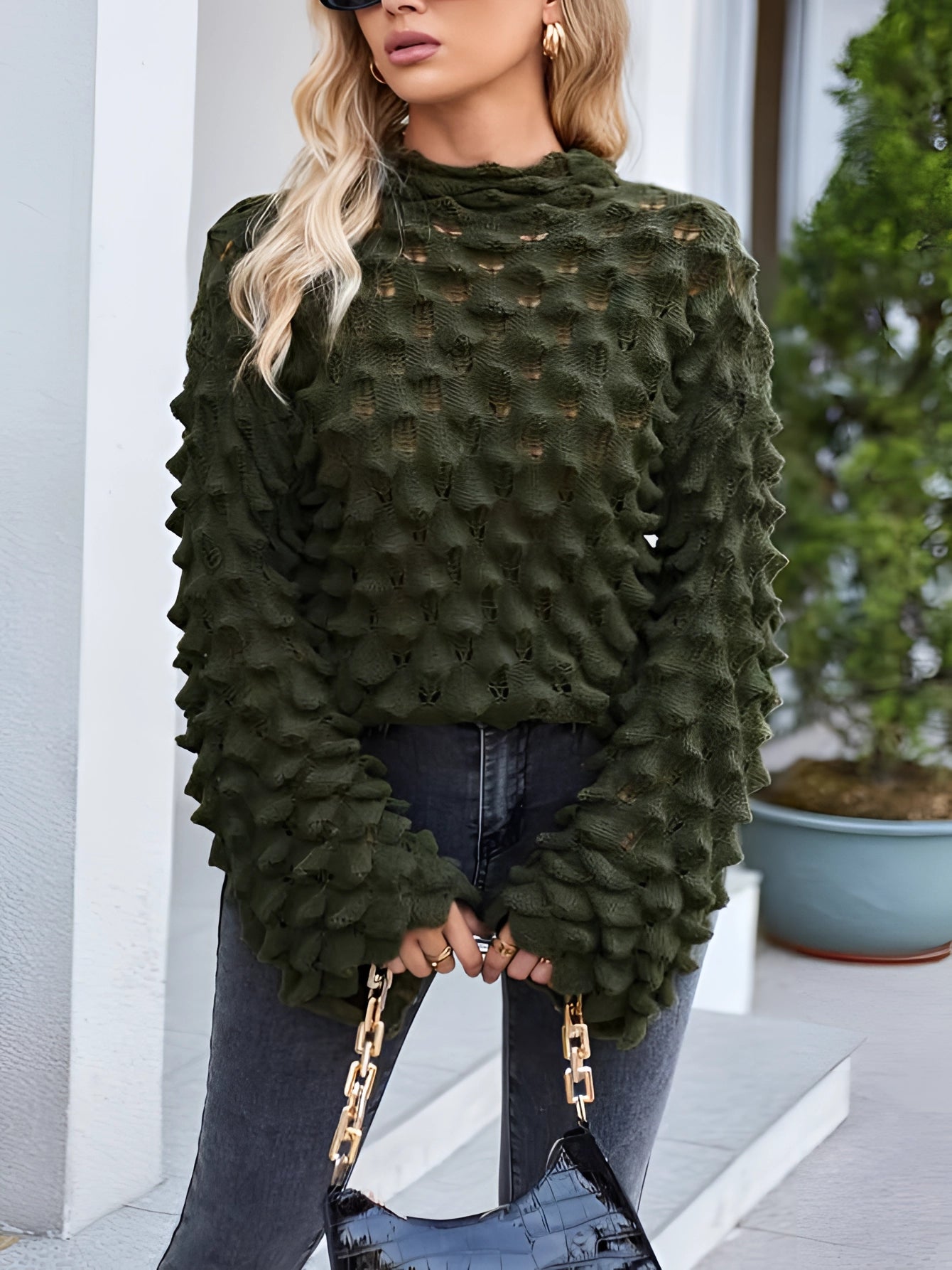 The Olive Green Chunky Knit Pullover with Puff Sleeves is a standout piece in fall fashion, offering a unique blend of classic and contemporary styles. This elegant knit pullover, known as the Gylora Damen Strickpullover, features playful ruffle details that add a stylish flair to any ensemble. Crafted from soft knit material, it ensures maximum comfort while maintaining a feminine touch that elevates everyday outfits. Available in a rich green color, this pullover is designed to suit a variety of sizes, ranging from S to XXL, making it an inclusive choice for all body types. The standout features of this pullover include its fashionable ruffles, which provide a feminine and playful look, the soft knit material that guarantees comfort, and its versatile nature, making it perfect for both casual wear and special occasions. Whether you're dressing up for a day out or attending a special event, this pullover is a versatile addition to your wardrobe, offering both style and comfort. Its ability to be paired with various outfits makes it an essential piece for the fall season, ensuring you stay warm and stylish. The Olive Green Chunky Knit Pullover with Puff Sleeves is not just a garment; it's a statement piece that combines elegance with everyday practicality.