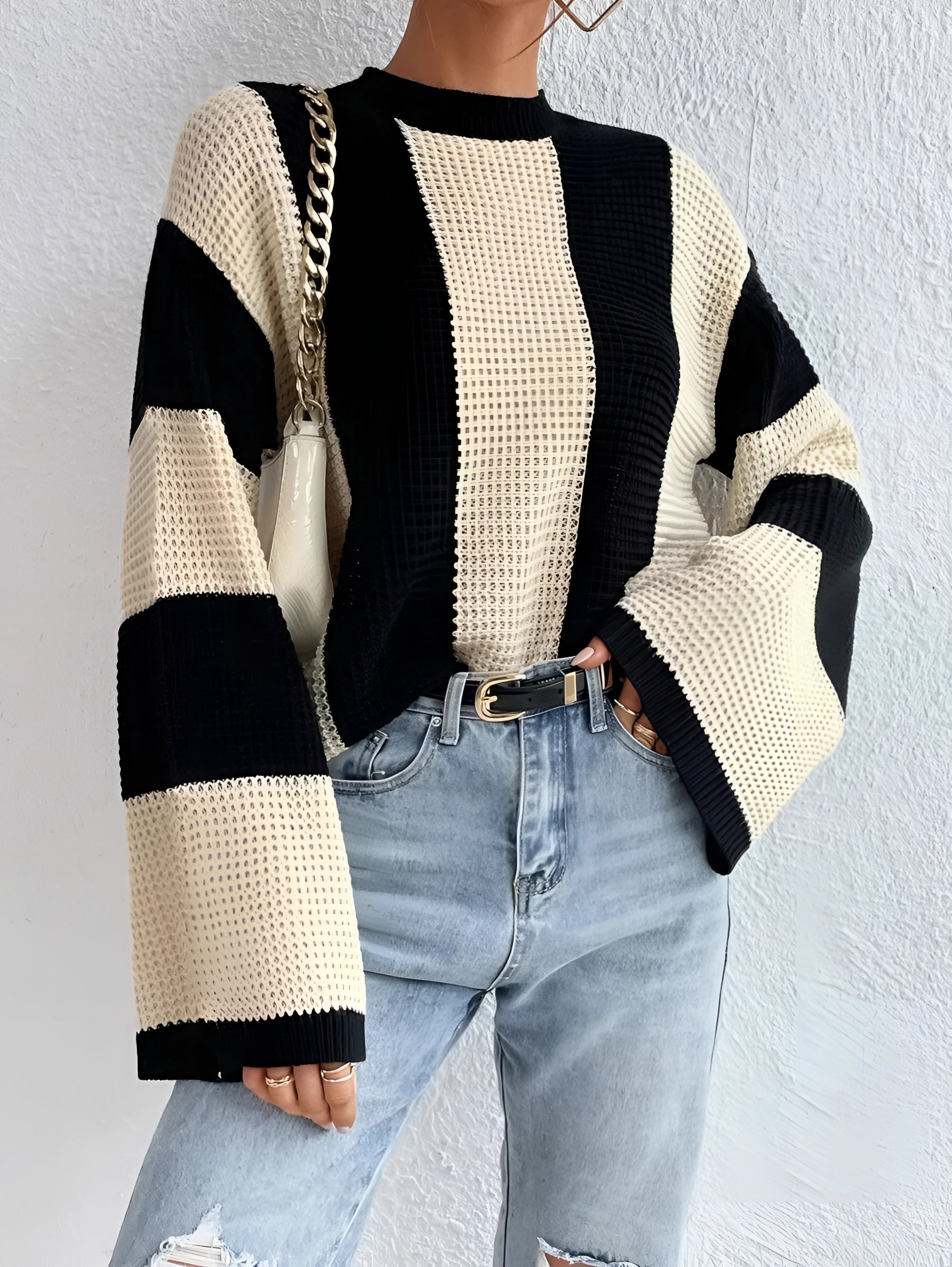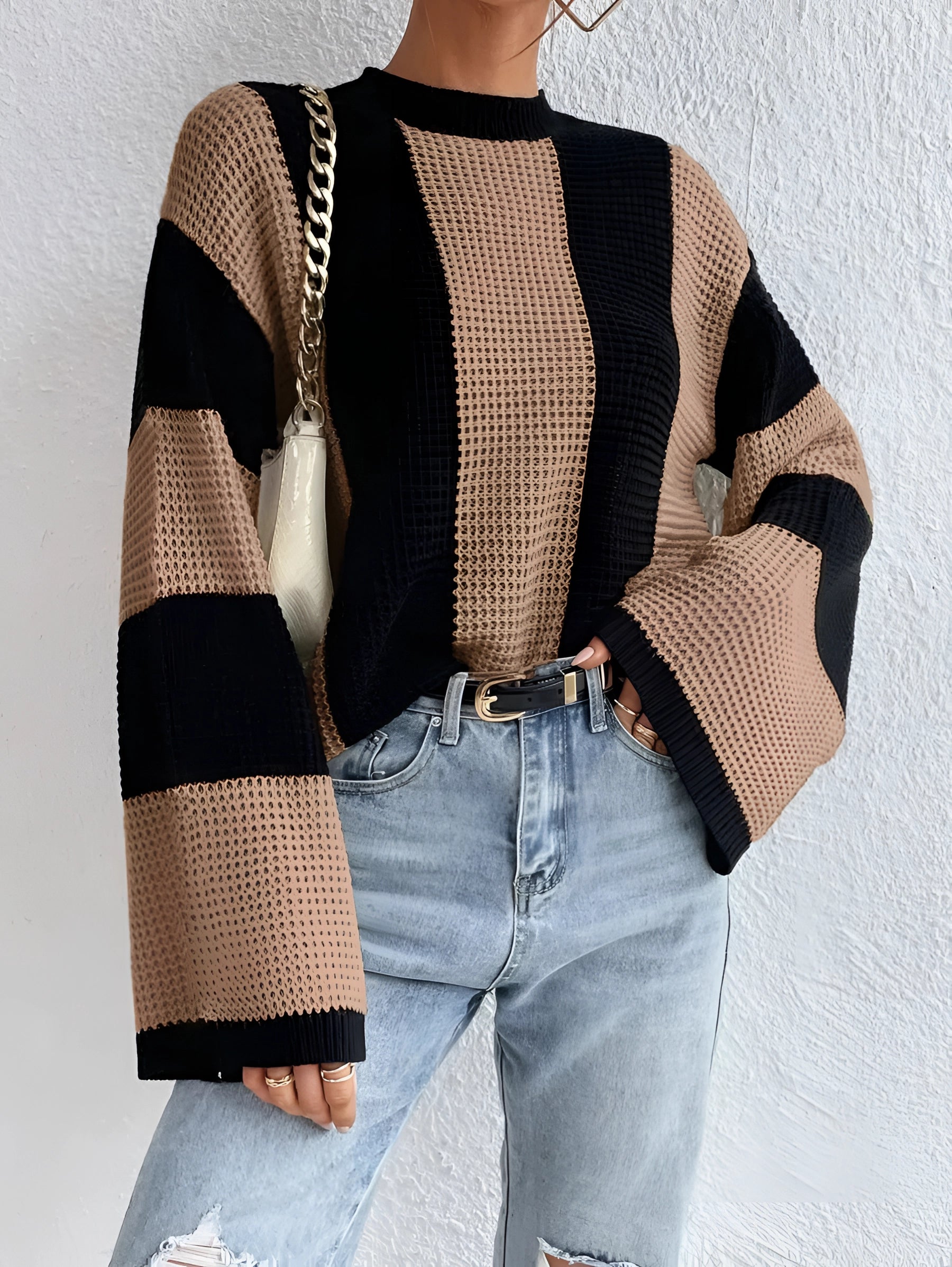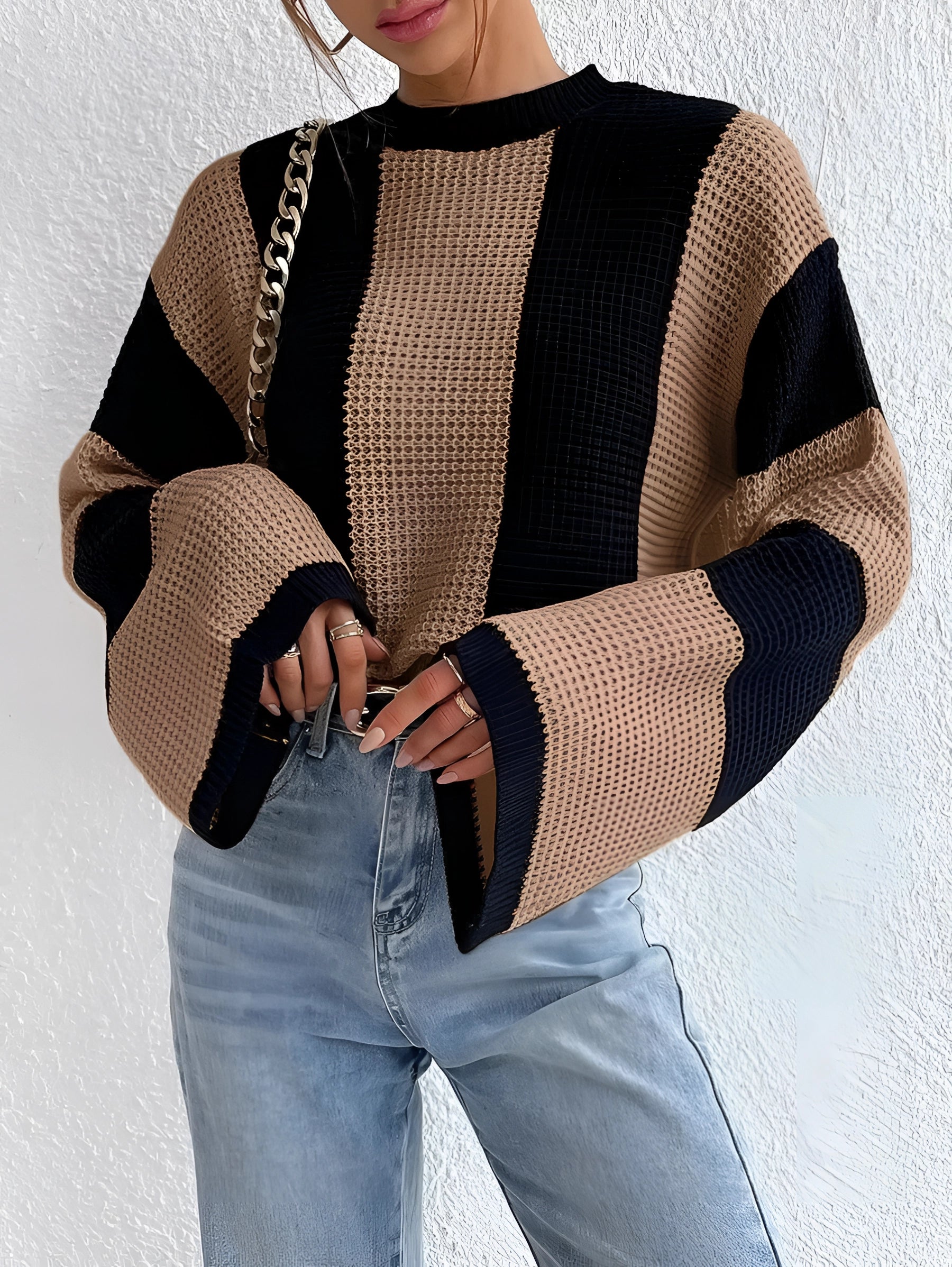 The Oversized Chunky Black Tan Striped Knit Sweater, also known as the Almira Strickpullover, is a standout piece in autumn fashion, offering a blend of modern contrast colors and a casual style that is perfect for everyday wear. This sweater is available in two elegant color options, Apricot and Khaki, and comes in sizes S, M, and L, ensuring a fit for various body types. The Almira Strickpullover is designed with striking contrast colors that give it a fresh and modern look, making it a unique addition to any wardrobe. Its loose sleeves and soft knit material provide exceptional comfort, making it ideal for daily use. Whether paired with jeans for a casual outing or a skirt for a more chic appearance, this sweater is versatile enough to suit a range of outfits and occasions. The key selling points of this sweater include its eye-catching design, comfortable fit, and versatility, making it a must-have for anyone looking to refresh their wardrobe with a stylish and functional piece. The Almira Strickpullover not only promises a fashionable look but also ensures comfort and adaptability, making it a perfect choice for those who appreciate both style and practicality in their clothing.