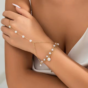 Discover elegance with our Pearl Hand Chain Bracelet, the ultimate luxurious wrist wear for women. This adjustable pearl and gold bracelet is perfect for brides and sophisticated events, making it a timeless piece of luxury hand jewelry. Elevate your style and make a statement at any occasion.