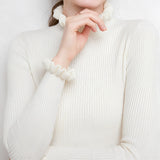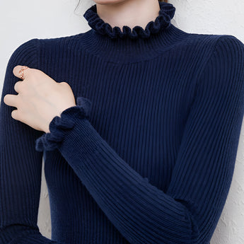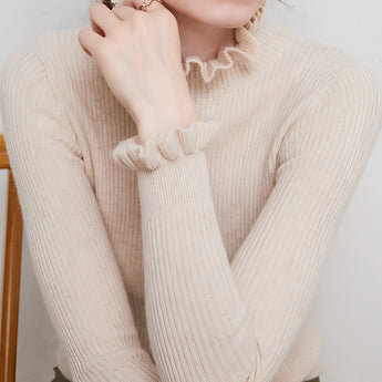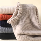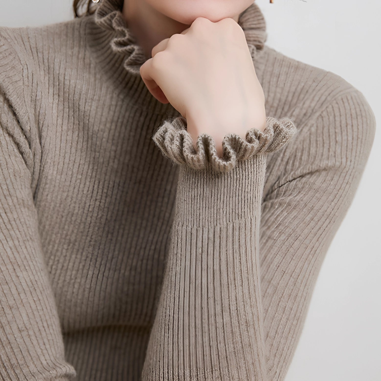 The Ribbed Cashmere Sweater, also known as the Una Rüschensweater, is a luxurious piece of winter knitwear that combines style and comfort effortlessly. Crafted from high-quality cashmere, this sweater is available in a variety of colors including Braun, Beige, Black, Gray, Blue, Auburn, and White, ensuring a perfect match for any wardrobe. The sweater is designed with a refined stand-up collar and fashionable ruffled sleeves, making it suitable for any occasion, whether it's a day at the office or a dinner with friends. Available in sizes ranging from S to 2XL, it offers a flattering slim fit that accentuates the silhouette while providing comfort. The elegant ruffle details add a feminine touch to your look, making it a versatile piece that can be paired with jeans, skirts, or layered under a blazer. This sweater is not just a piece of clothing but a statement of elegance and sophistication, making it a must-have addition to your wardrobe. Its unique selling points include the elegant ruffle details, the comfortable slim fit, and its versatility in styling, ensuring that it elevates any outfit it is paired with. The Una Rüschensweater is more than just a sweater; it's a blend of elegance and comfort that enhances your everyday style.
