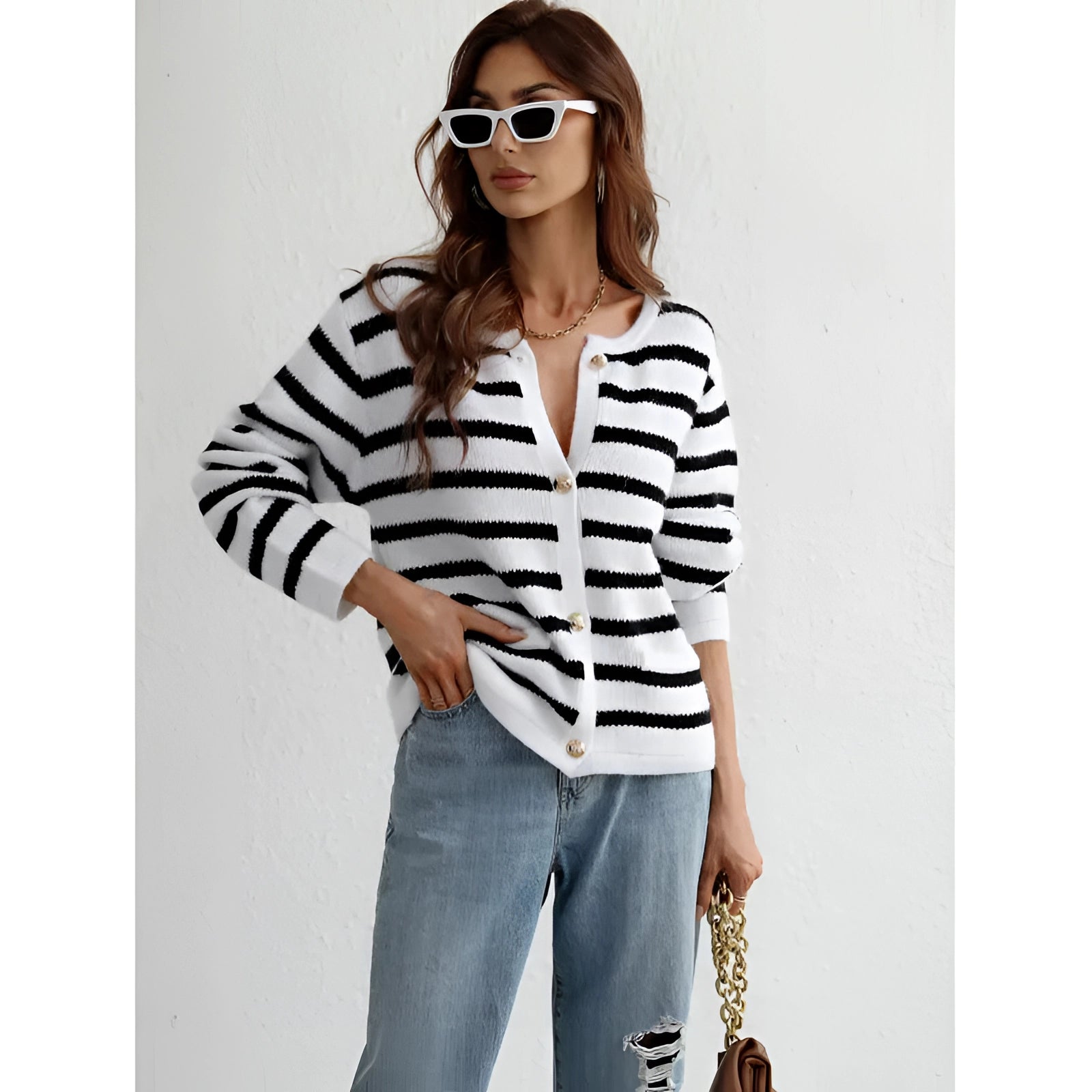 The Striped Blue & White Knit Cardigan is a casual chic button-up sweater that stands out with its unique zebra pattern, making it a must-have for trendsetters looking to make a statement. This cardigan is available in a variety of colors including black, blue, green, khaki, pink, and white, and comes in sizes ranging from S to XL, ensuring a perfect fit for everyone. The standout feature of this cardigan is its distinctive zebra design, which offers an unmistakable style that captures attention in any setting. Its versatility is another key selling point, as it seamlessly transitions from casual daywear to evening attire, making it a versatile addition to any wardrobe. Crafted from high-quality materials, this cardigan promises long-lasting comfort and a flattering fit, ensuring that you not only look good but feel good too. Whether you're dressing up for a night out or keeping it casual, the Striped Blue & White Knit Cardigan is the perfect choice for those who appreciate both style and comfort. Its unique design, versatility, and comfort make it an essential piece for anyone looking to enhance their wardrobe with a touch of modern flair.