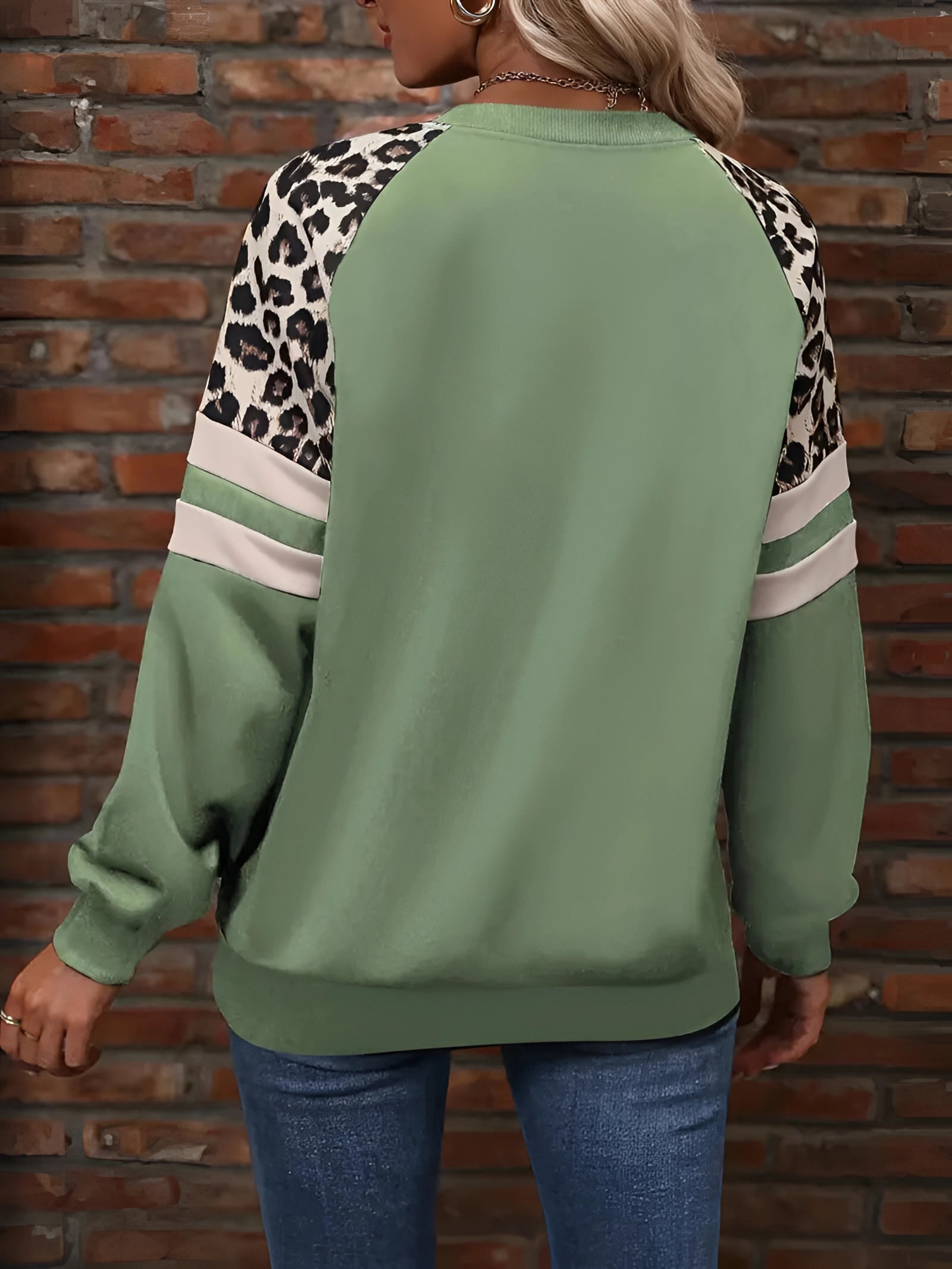 Trendy Leopard Print Sleeve Green Pullover - Women's Streetwear Top