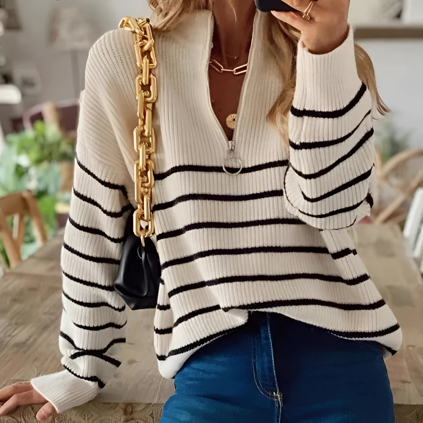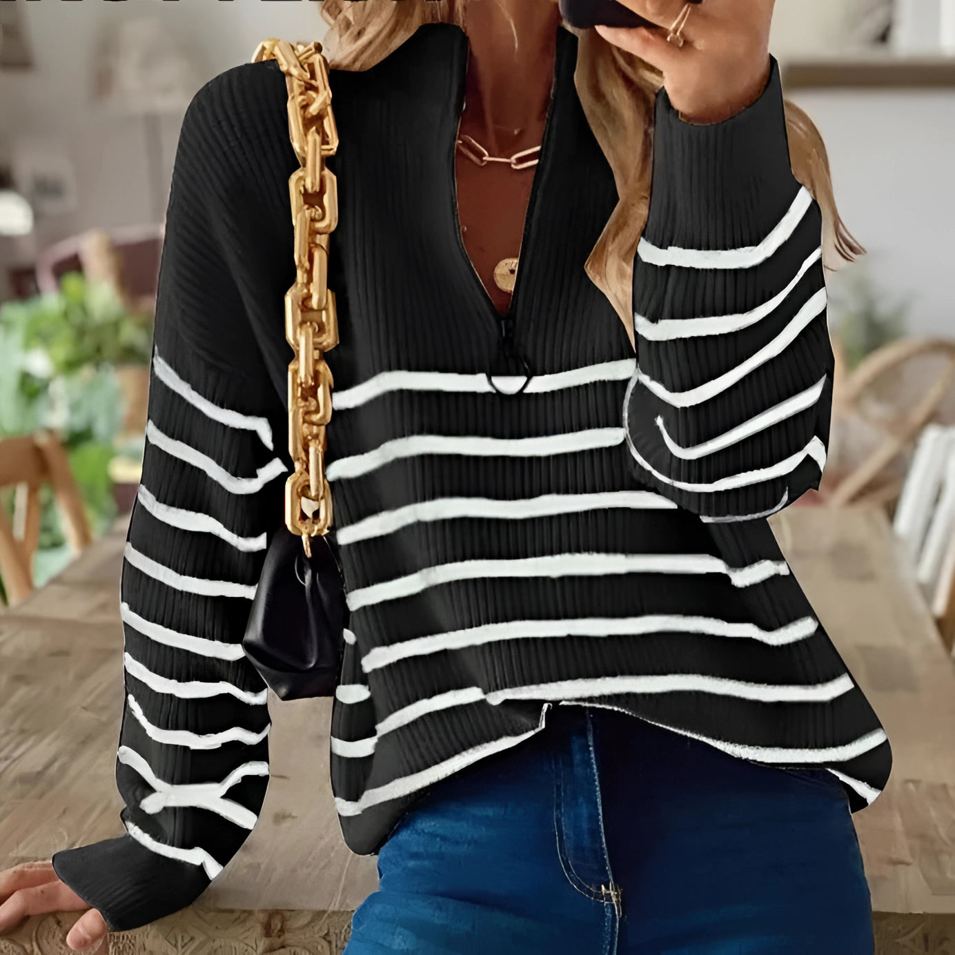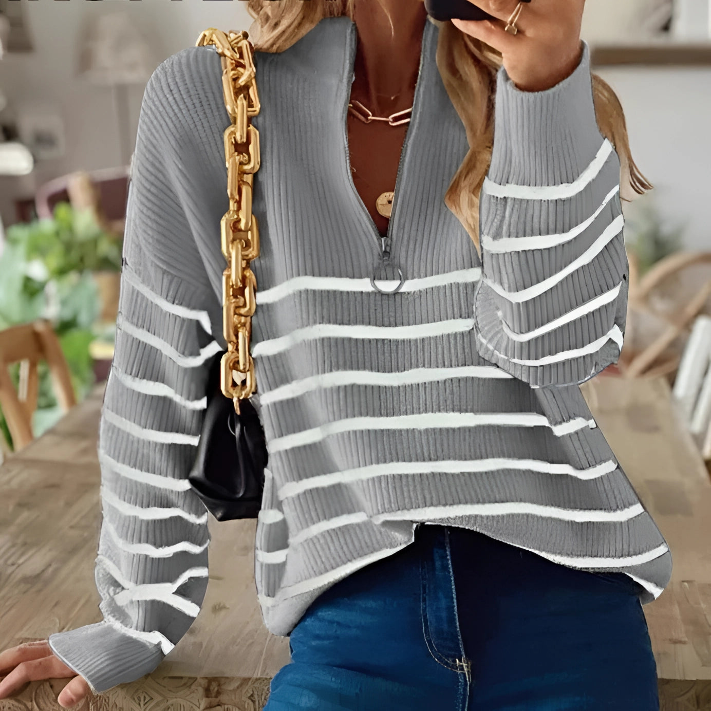 The Trendy Women's Striped V-Neck Ribbed Knit Fall Sweater is a must-have for the chilly autumn and winter months. This stylish pullover features a sophisticated striped design and a V-neck that adds a touch of elegance to any outfit. Its ribbed knit texture not only provides warmth but also ensures a comfortable fit, making it perfect for everyday wear. Available in sizes S, M, L, and XL, this sweater caters to a variety of body types, ensuring a flattering fit for everyone. The color options include Wit, Gray, and Black, allowing you to choose the perfect shade to match your personal style. The sweater's oversized fit and long sleeves offer a cozy feel, while the elegant zipper detail adds a modern twist to the classic design. Made from soft, high-quality materials, this sweater is designed to keep you warm without compromising on style. Whether you're heading out for a casual day with friends or simply lounging at home, this versatile sweater is the perfect addition to your wardrobe. With its combination of comfort, style, and practicality, the Trendy Women's Striped V-Neck Ribbed Knit Fall Sweater is an essential piece for the fashion-forward woman looking to stay warm and chic throughout the colder seasons.