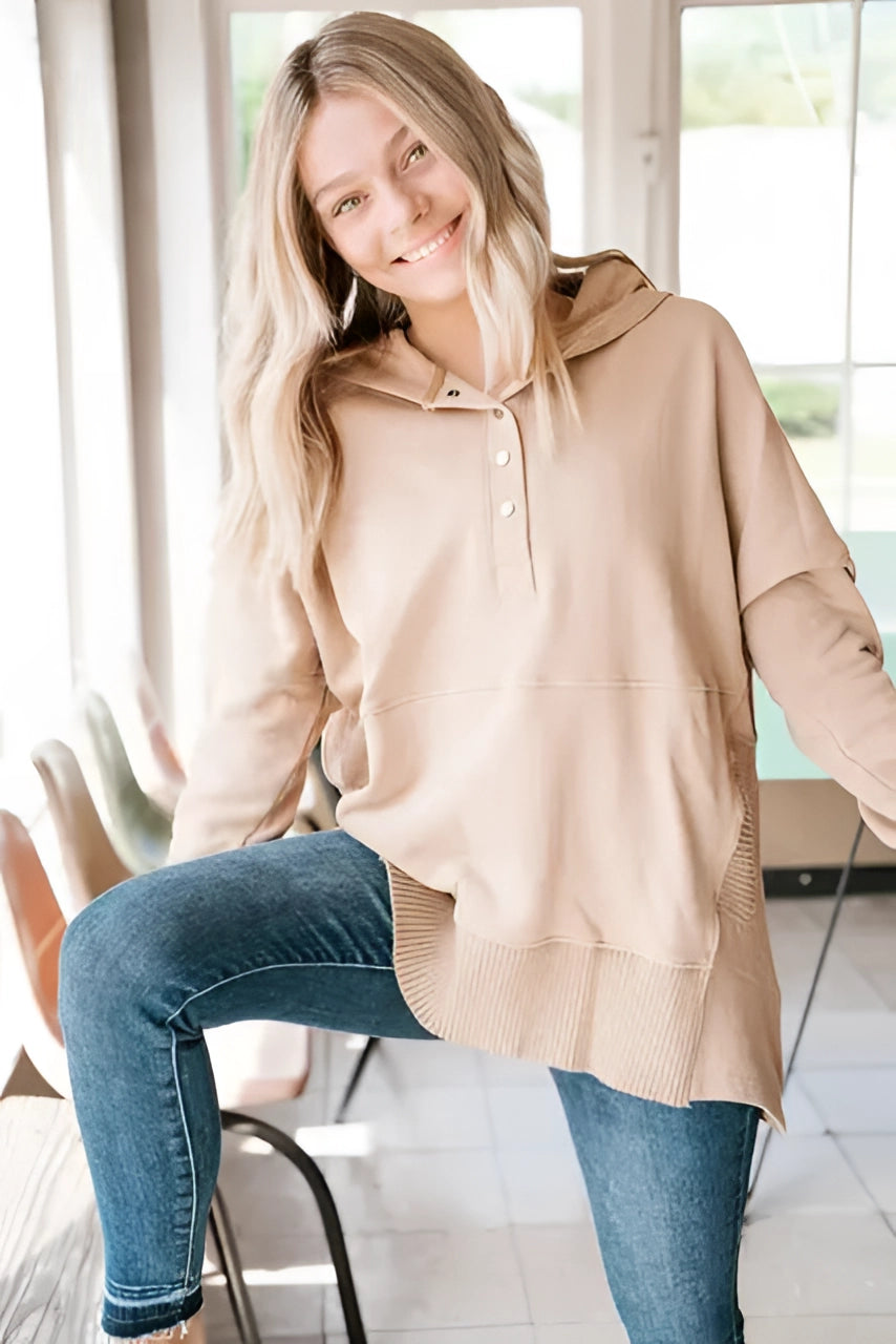 The Women's Beige Hoodie is a casual buttoned pullover with ribbed cuffs, designed to offer an uncomplicated style for everyday wear. Available in a variety of colors including Light Brown, Khaki, Black, Green Blue, Pink, Gray, Deep Khaki, and White Grey, this hoodie caters to diverse fashion preferences. It comes in sizes ranging from S to XXL, ensuring a comfortable fit for everyone. The Elza loose-fitting jacket with pockets is the perfect companion for relaxed days, combining style and functionality to complete any outfit. Its loose silhouette provides a comfortable wearing experience and freedom of movement, making it ideal for casual outings. The generous pockets are practical, offering ample space for your everyday essentials, enhancing the hoodie’s functionality. The timeless design of this hoodie makes it versatile and easy to pair with various looks, ensuring it remains a staple in your wardrobe. Whether you're dressing up for a casual day out or simply lounging at home, this hoodie promises to deliver both comfort and style. Its ribbed cuffs add a touch of detail, while the buttoned front allows for easy wear and removal. This hoodie is not just a piece of clothing; it's a blend of comfort, practicality, and timeless fashion, making it a must-have addition to your collection.