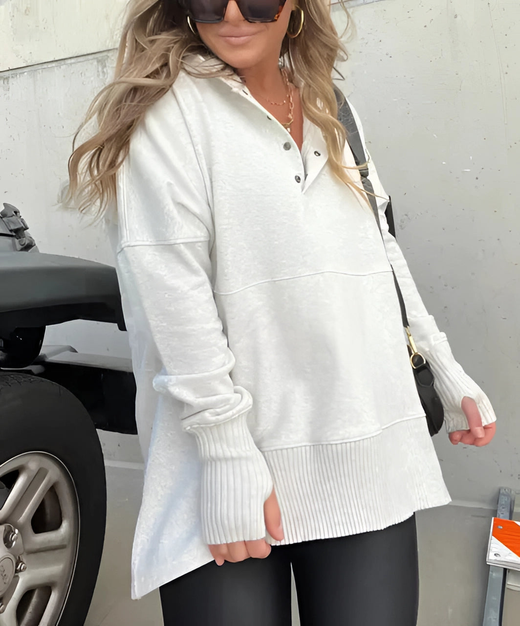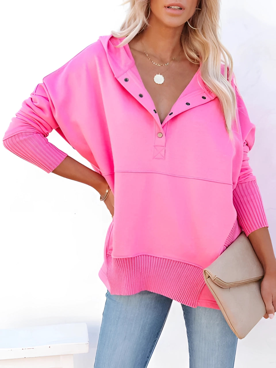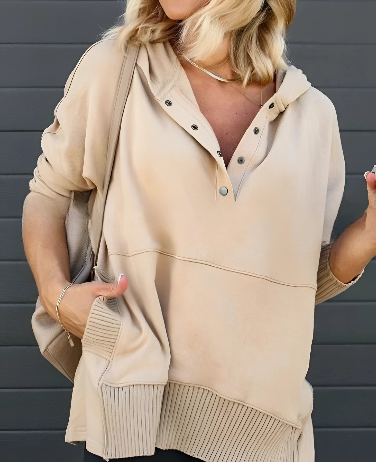 1 - Women's Beige Hoodie - Casual Buttoned Pullover, Ribbed Cuff |