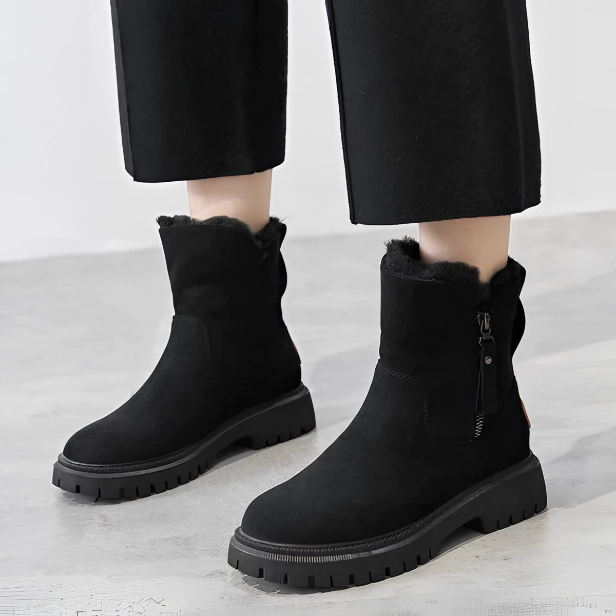 1 - Women's Black Fur-Lined Ankle Boots with Zipper - Chunky Sole |