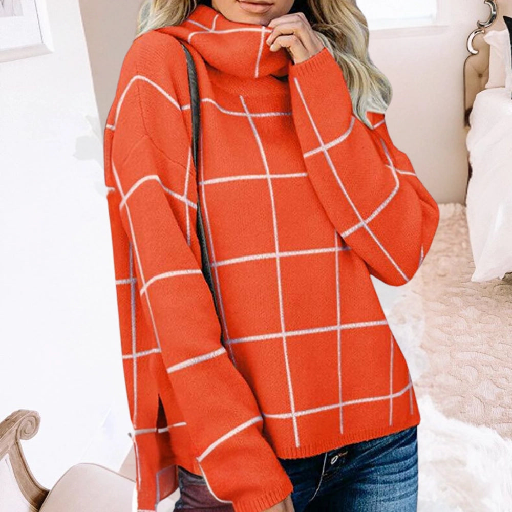 1 - Women's Grey Plaid Fleece Sweater - Cozy High Neck Pullover