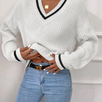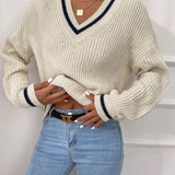 The Women's Preppy V-Neck Ribbed Knit Cream Sweater with Navy Trim is a stylish and versatile addition to any fall wardrobe. This sweater is available in a range of colors including Beige, Gray, Pink, and White, and comes in sizes S, M, L, and XL, ensuring a perfect fit for every woman. One of the standout features of this sweater is its unique patchwork design, which adds a touch of artistry and individuality to your outfit, making each piece a small masterpiece. The flattering V-neckline not only enhances your décolleté but also provides a comfortable wearing experience, making it suitable for both casual and semi-formal occasions. Crafted from high-quality polyester, this sweater promises a soft and cozy feel against the skin, making it an ideal choice for the cooler months. The combination of its creative design, comfortable fit, and soft fabric makes this sweater a must-have for any style-conscious woman looking to update her fall wardrobe. Whether you're dressing up for a day out or keeping it casual, this ribbed knit jumper is sure to become a staple in your closet, offering both aesthetic appeal and practical comfort. The navy trim adds a preppy touch, making it a versatile piece that can be dressed up or down depending on the occasion.
