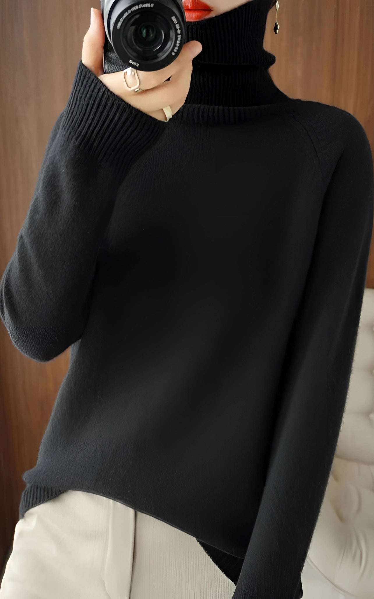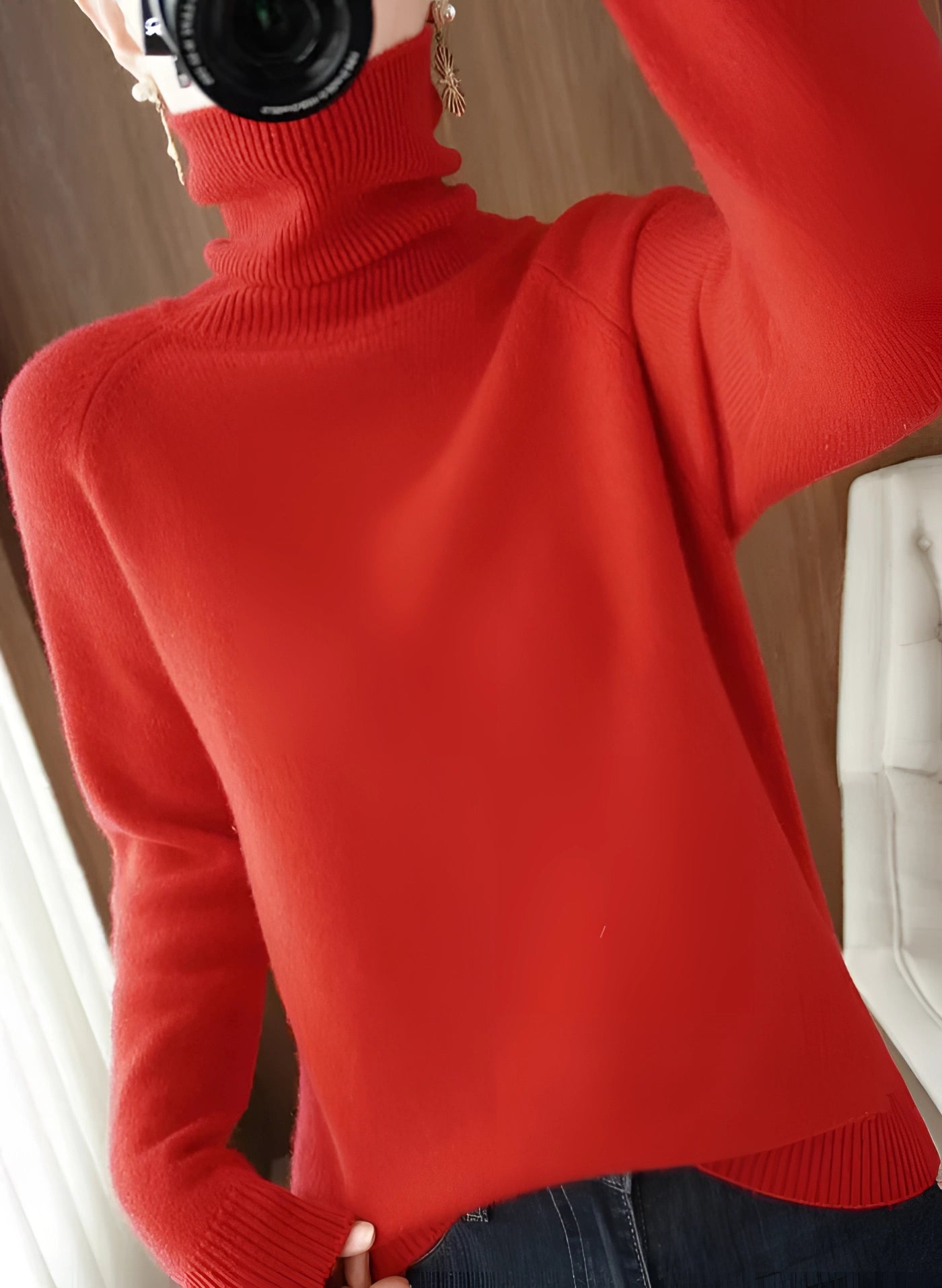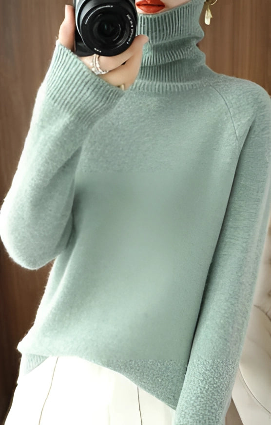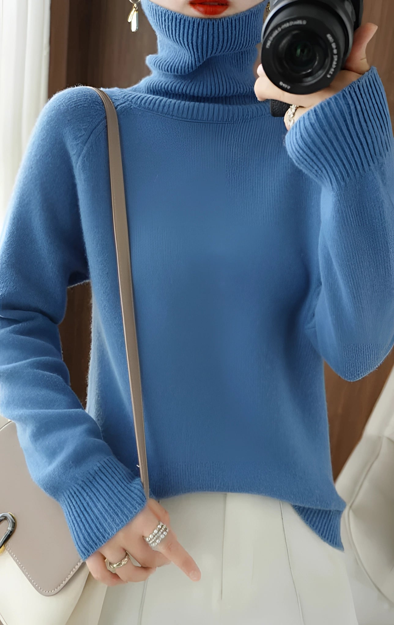 Women's Slim Fit Blue Turtleneck Sweater - Ribbed Cuff Winter Fashion
