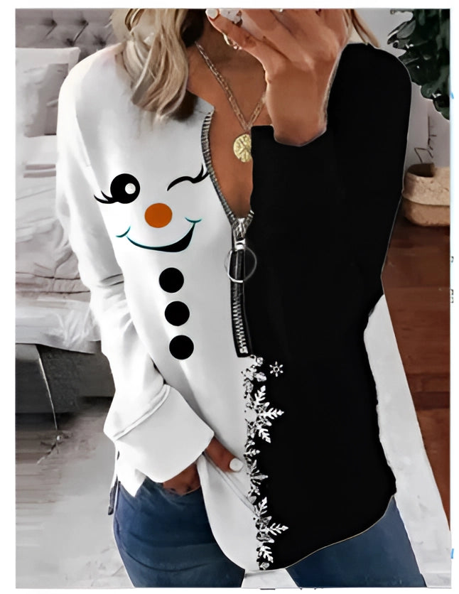1 - Women's Winter Snowman Sweater - Asymmetric Zip-Up Christmas Top |